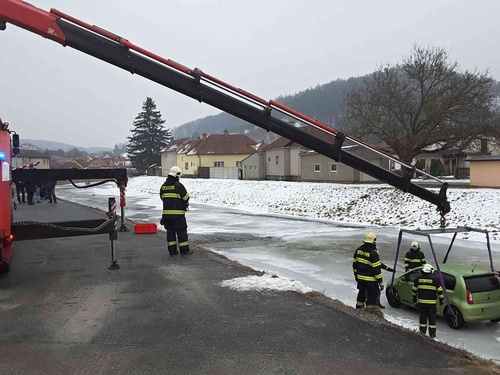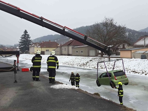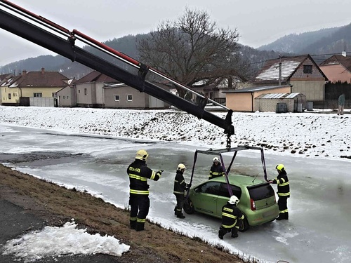 Hasiči vyprošťovali auto ze zamrzlé řeky