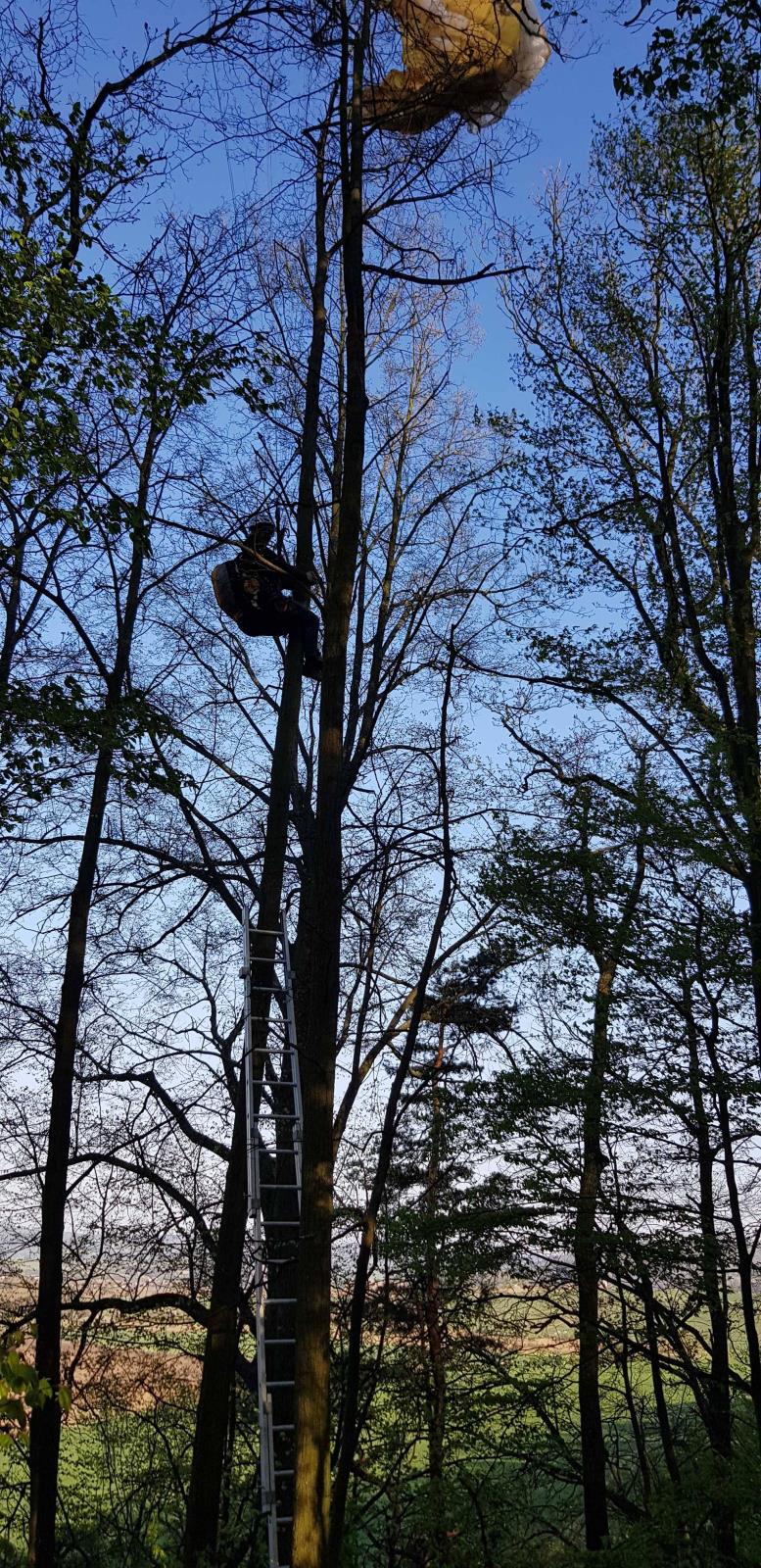 Středa, 22. dubna - Čtyři jednotky hasičů vyjížděly k záchraně muže, který uvízl se svým paraglidingovým křídlem v koruně stromu. Muž vyvázl z nehody bez zranění.