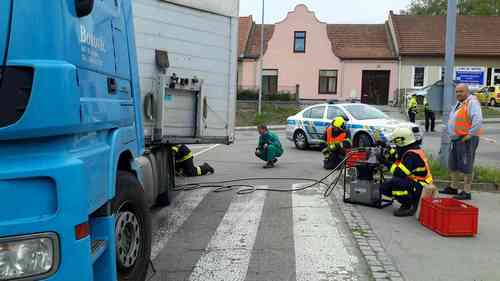 Jednotky brněnských profesionálních hasičů ze stanic Lidická a BVV zasahovaly ve čtvrtek, 25. května 2017, v Brně, na ul. Bohunická. V křižovatce se odjistil naložený 25 tunový návěs kamionu. Hrozilo tak jeho převrácení. Celá souprava navíc blokovala křižovatku ulic Bohunická a Vídeňská.