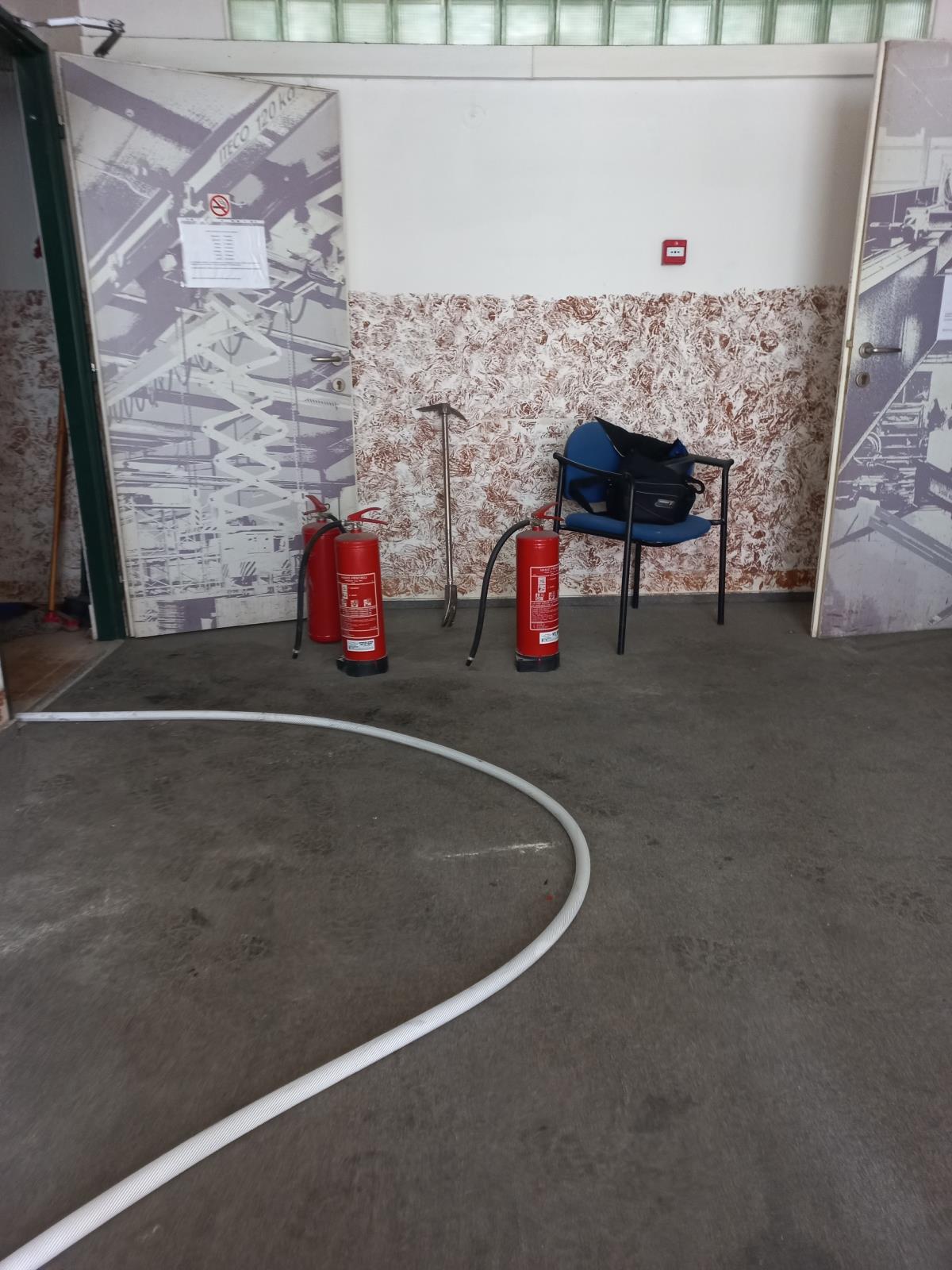 Při našem příjezdu byl požár z části uhašen použitím přenosných hasicích přístrojů a k jeho dohašení stačil nástěnný hydrant.