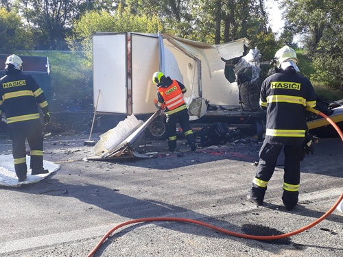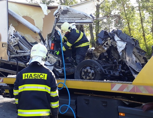 Na místo po šesté hodině vyjela jednotka ze stanice Hodonín a Brno-Lidická s technickým automobilem. Po střetu dodávky a nákladního auta museli hasiči řidiče ze zdemolované kabiny dodávky vyprostit. Svým zraněním však na místě podlehl.