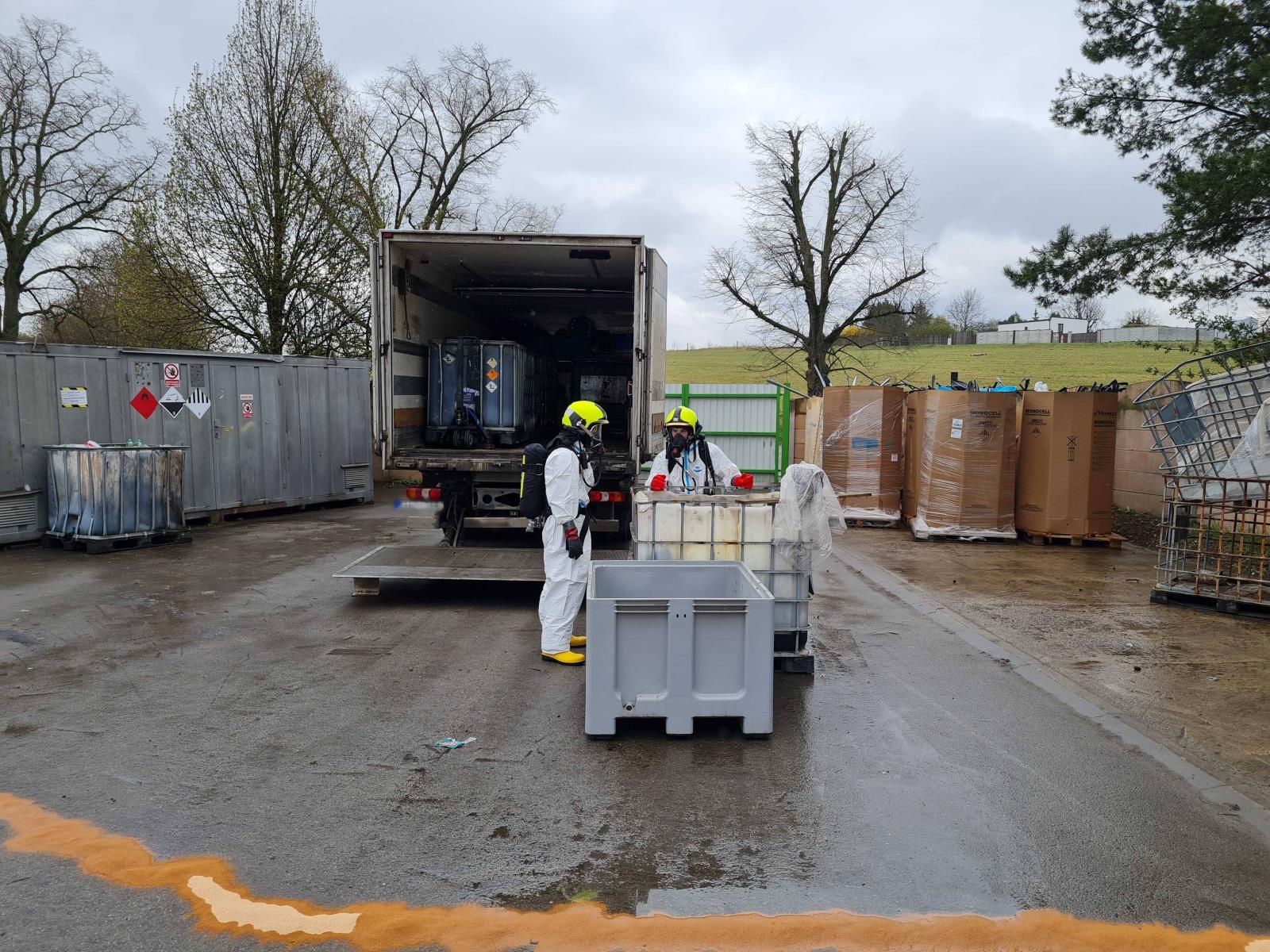 Hasiči na místě vytyčili nebezpečnou zónu. V dýchací technice a jednorázových protichemických ochranných oděvech zajistili látky do bezpečného kontejneru, vyčistili nákladní prostor vozidla a příslušníci z chemické laboratoře odebrali vzorky.