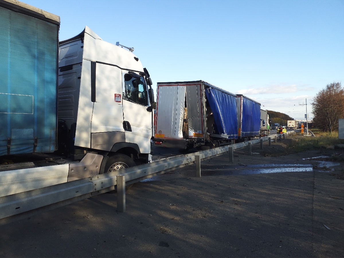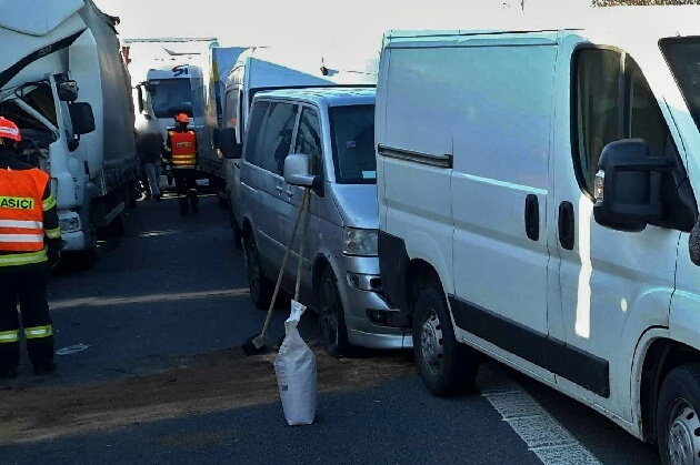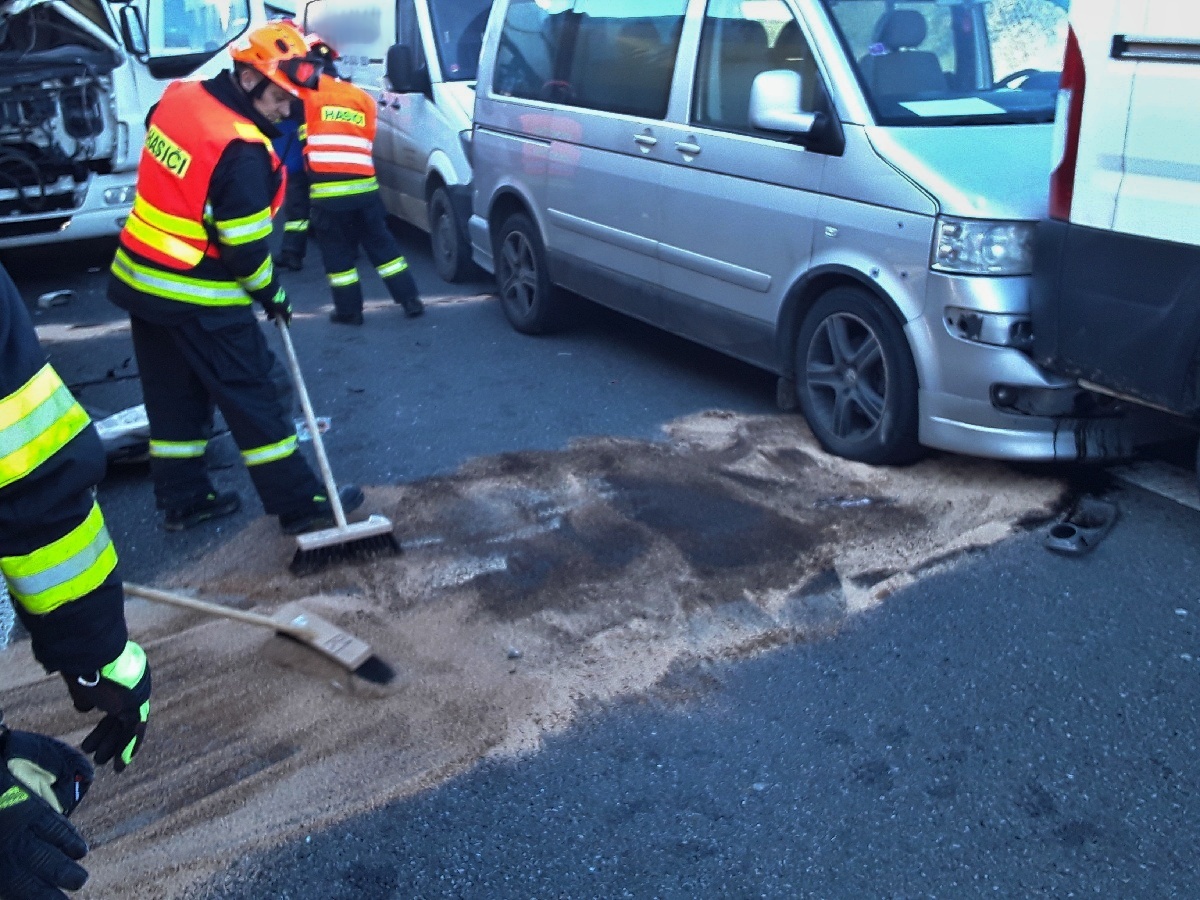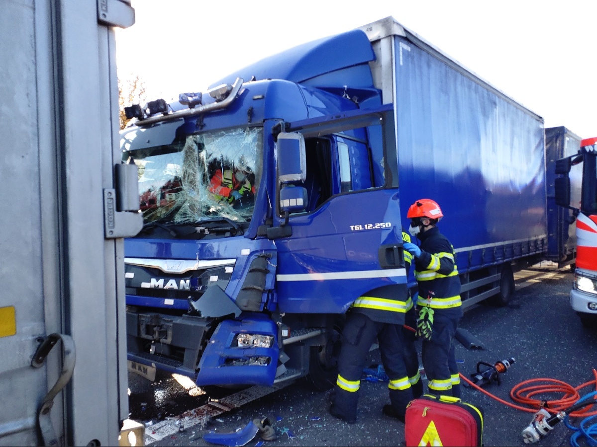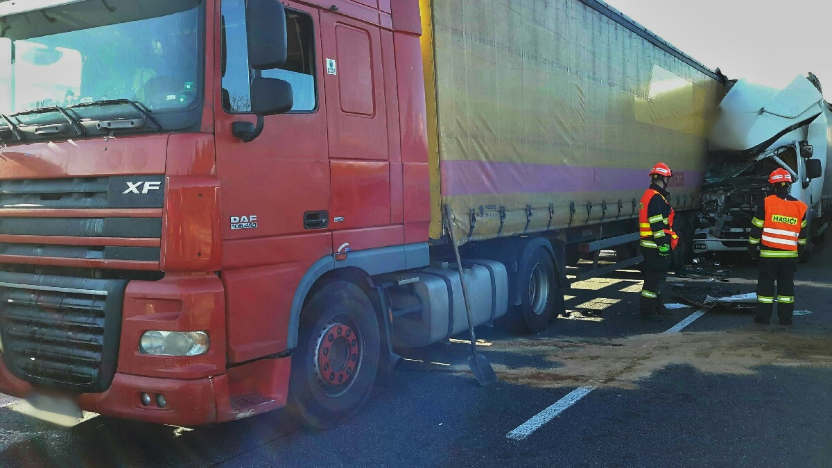 Obě nehody se staly před Brnem ve směru od Prahy. K první vyjely čtyři profesionální hasičské jednotky krátce po čtvrt na dvě odpoledne. Na 187,5. kilometru se střetly dva kamiony a několik dodávek. Dálnice byla zcela zablokovaná. Místo však bylo možné objíždět přes přilehlou čerpací stanici. Při nehodě se zranil jeden člověk. Hasiči uklidili vozovku a odstranili havarované dodávky. Zbylé následky nehody bude řešit specializovaná odtahová firma. Hasiči na místě zasahovali do 14,21 hod.