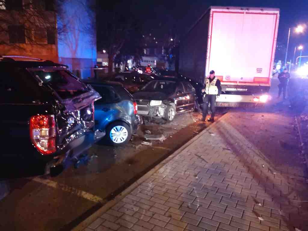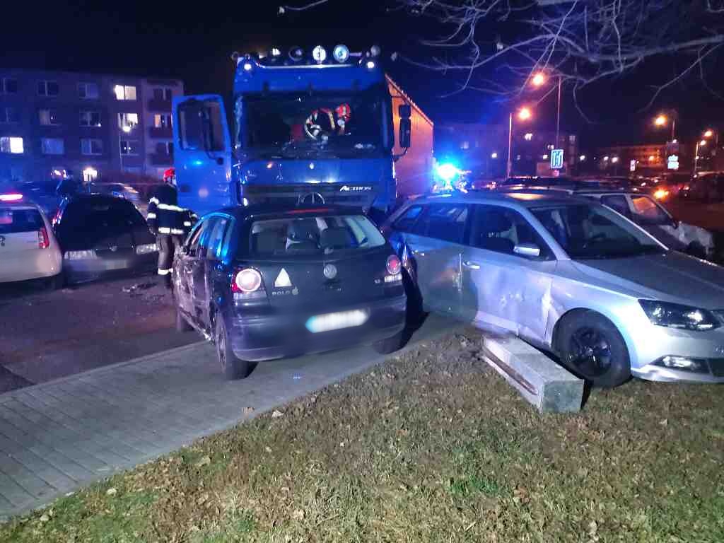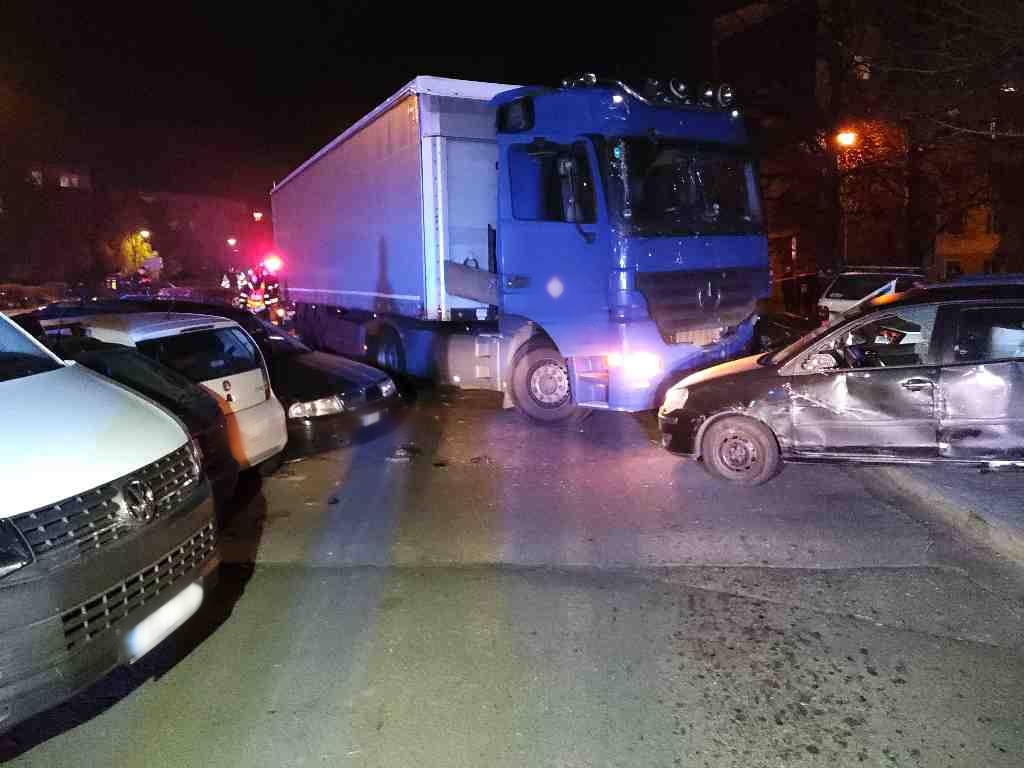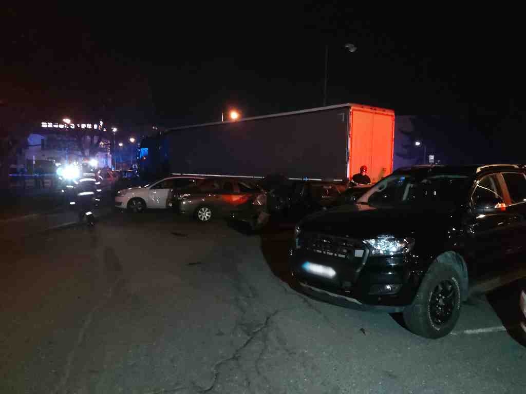 Po příjezdu bylo zřejmé, že nákladní vůz s návěsem vyjel z komunikace na přilehlé parkoviště. Celkem naboural asi 13 zaparkovaných osobních aut. Událost se obešla bez zranění.
