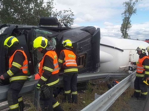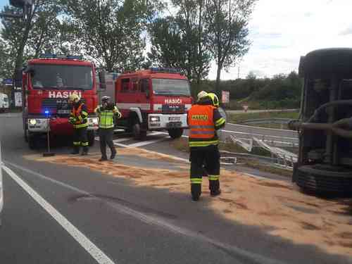 Nájezd k dálnici D1 na 201. km ve směru na Prahu dnes,  15. září 2017 dopoledne zablokovala nehoda kamionu.  Řidiče nebylo nutné vyprostit a při příjezdu našich jednotek byl v péči ZZS. Hasiči se postarali o likvidaci následků úniku provozních látek a zajištění místa proti požáru. Převrácenou soupravu bude zvedat zpět na kola specializovaná firma. Hasiči ukončili činnost na místě