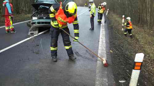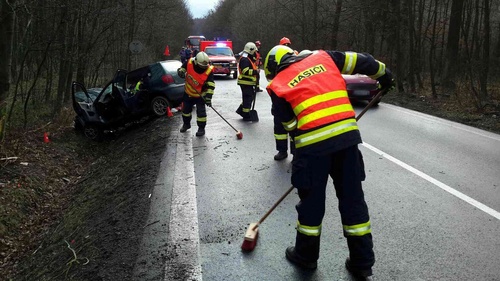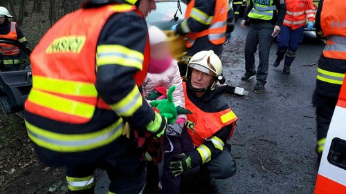 Při havárii osobního automobilu se zranily čtyři osoby včetně dvou dětí. Zasahující jednotky zabezpečily vozidlo proti vzniku požáru a zraněným osobám poskytly první pomoc. Dětem hasiči věnovali plyšové dráčky Hasíky. Po úklidu komunikace a naložení havarovaného automobilu na vozidlo odtahové služby se hasiči vrátili na své základny.