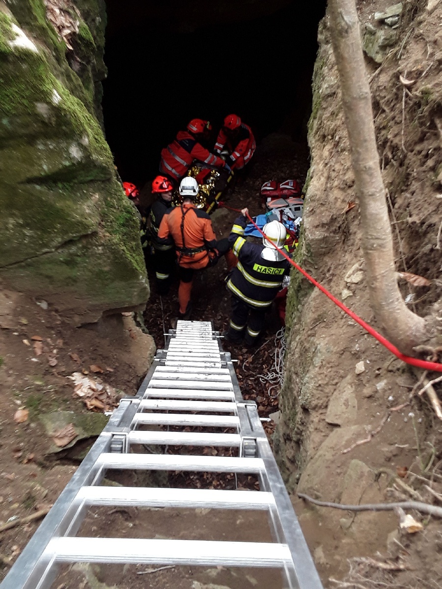 Za 9 minut od ohlášení události byla první jednotka na místě zásahu. Hasiči zjistili, že mladý muž spadl do skalní průrvy a zůstal zraněný asi 6 metrů hluboko. Hasiči i posádka ZZS sestoupili ke zraněnému a poskytli mu první pomoc. Následovala příprava na transport z hloubky. Pomocí nastavovacích žebříků, transportní vany a lanové techniky vyprostili hasiči mladíka přibližně po půl hodině ze skalní průrvy a transportovali jej k vrtulníku záchranné služby, který přistál na nedaleké sinici. Provoz byl během zásahu zastavený.