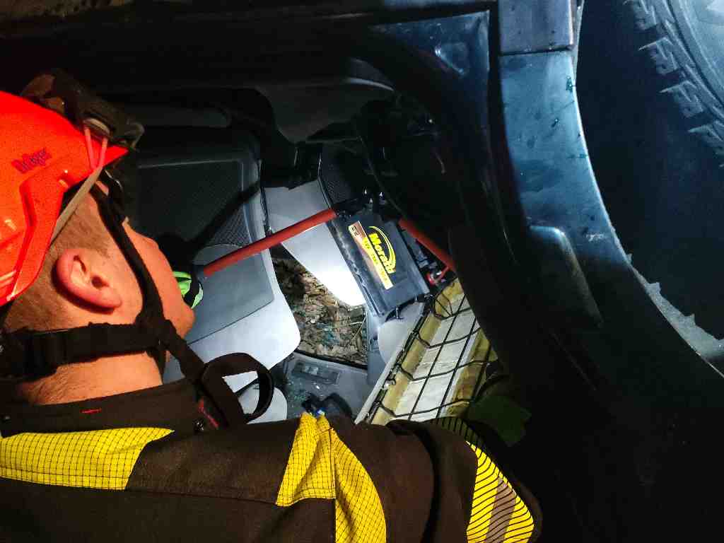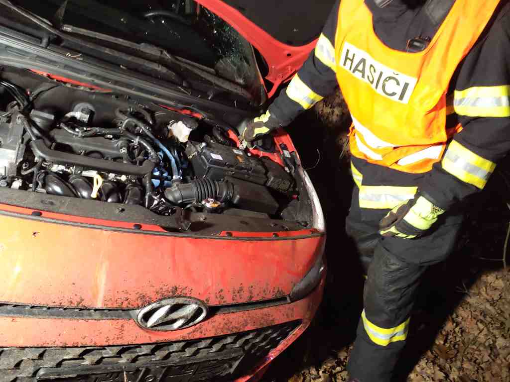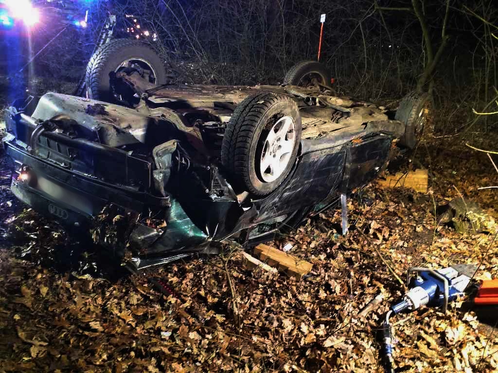 Vozidlo zn. Audi skončilo po nehodě mimo komunikaci a převrácené na střeše. Po příjezdu první jednotky hasiči zjistili, že pod vozem se nachází zraněný řidič. Tento byl při vědomí. Hasiči vrak vozu nejprve stabilizovali. K jeho následnému nadzvednutí a záchraně zraněného použili hydraulické rozpínáky.