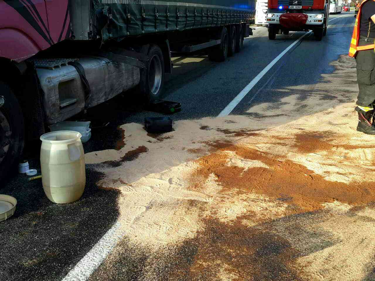Středa, 12. červen 2019 - Dnes krátce před 6. hodinou ráno vyjely jednotky k nehodě osobního auta a kamionu na silnici I/50 u obce Nevojice na Vyškovsku. Při nehodě se zranil řidič osobního vozu. Hasiči zajistili místo proti požáru a zachytávali unikající naftu z poškozené nádrže kamionu. Již vyteklou naftu zasypali na vozovce sorbentem a zbytek z nádrže přečerpali. Silnice byla během zásahu uzavřená. Po osmé hodině byl provoz obnoven kyvadlově a jednotky se vrátily zpět na základnu. Na místě zůstala Policie ČR.