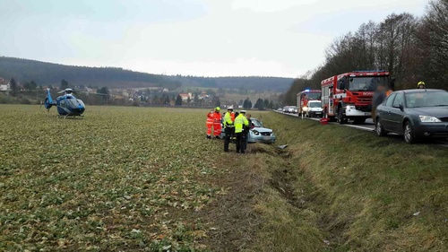 Po střetu dvou osobních aut zůstalo jedno na silnici a druhé v poli vedle vozovky. Hasiči poskytli dvěma zraněným první pomoc do příjezdu záchranné služby.