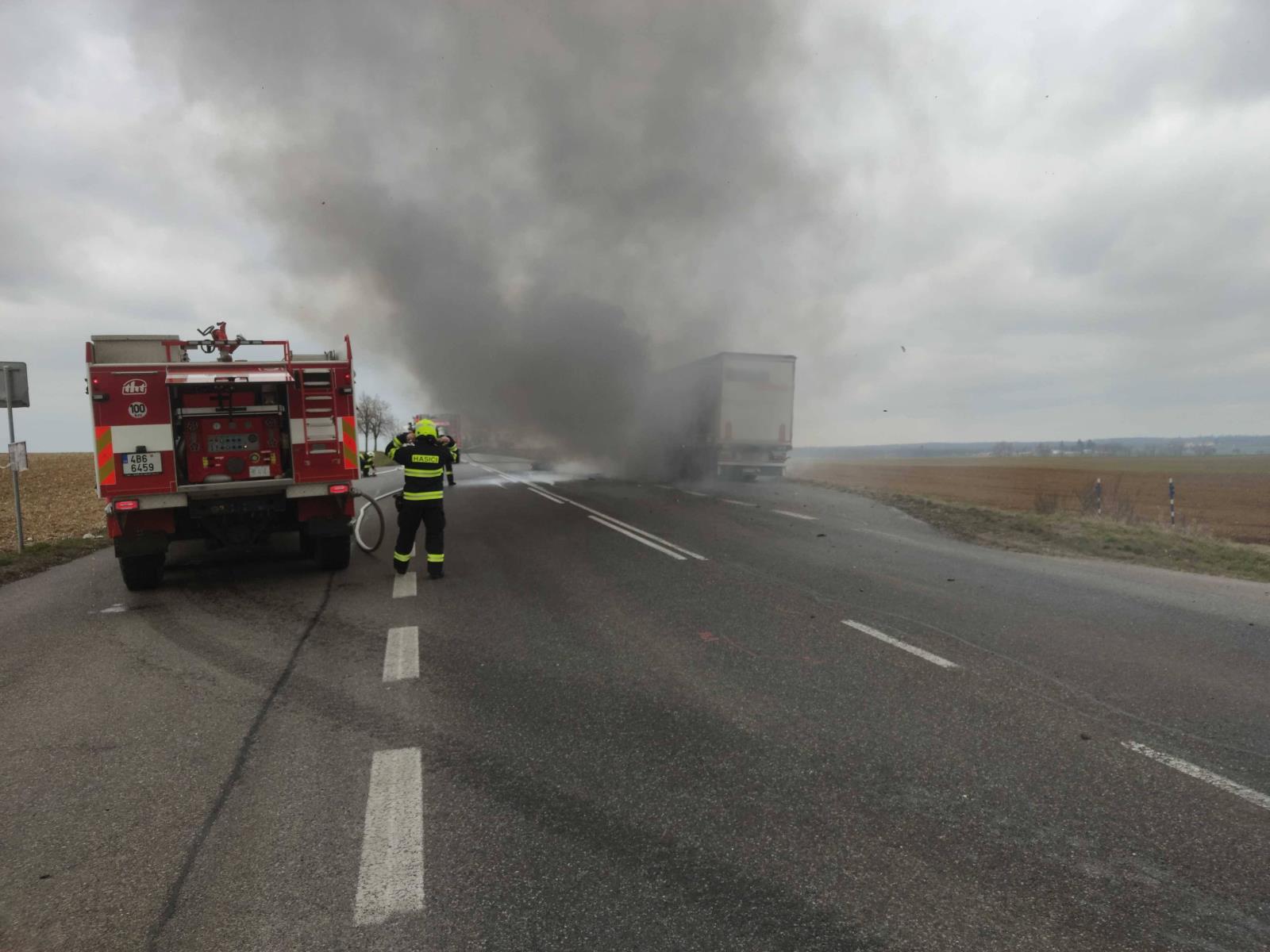 První jednotka přijela na místo v 11.48 hod. a hasiči zjistili, že hoří větší část kamionu. Řidič byl mimo vozidlo, ale vzhledem k tomu, že byl zraněný, povolali hasiči na místo záchrannou službu. Do příjezdu ZZS poskytli muži první pomoc.