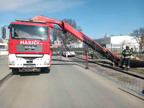Zametací vůz se propadl pod vozovku, hasiči zasahovali a