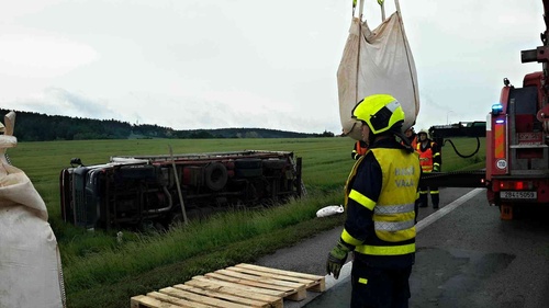 Tři jednotky profesionálních hasičů zasahovaly v úterý 15.května 2018 večer u převráceného nákladního automobilu u Lipůvky na...
