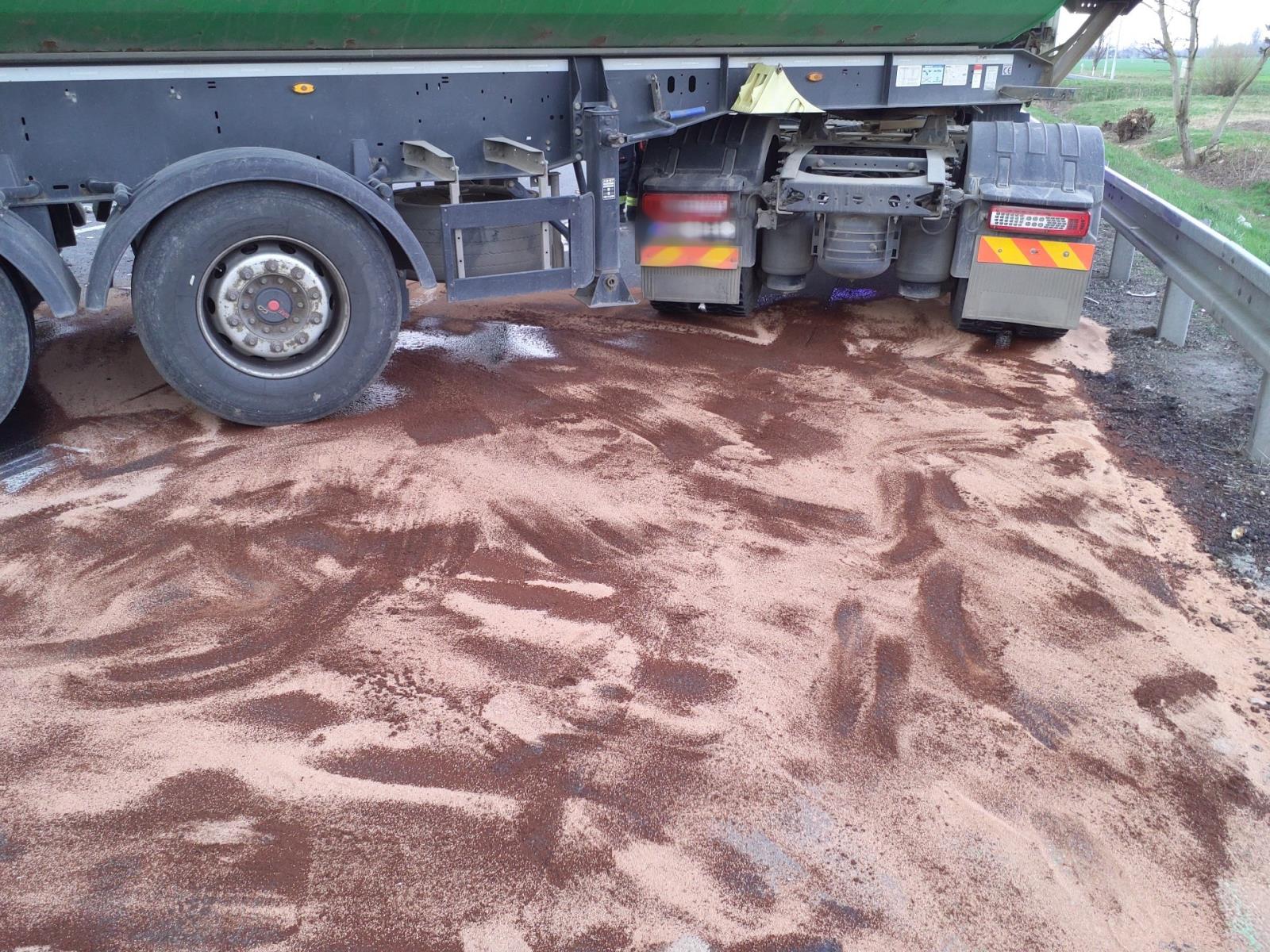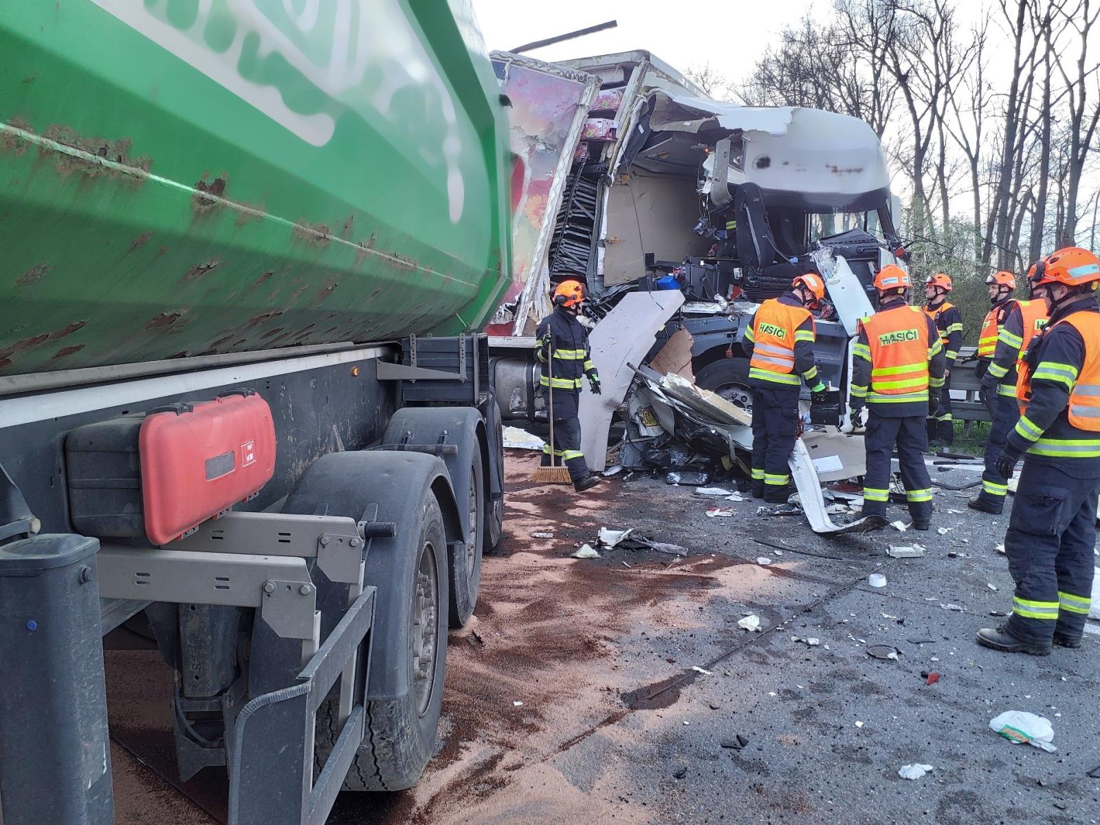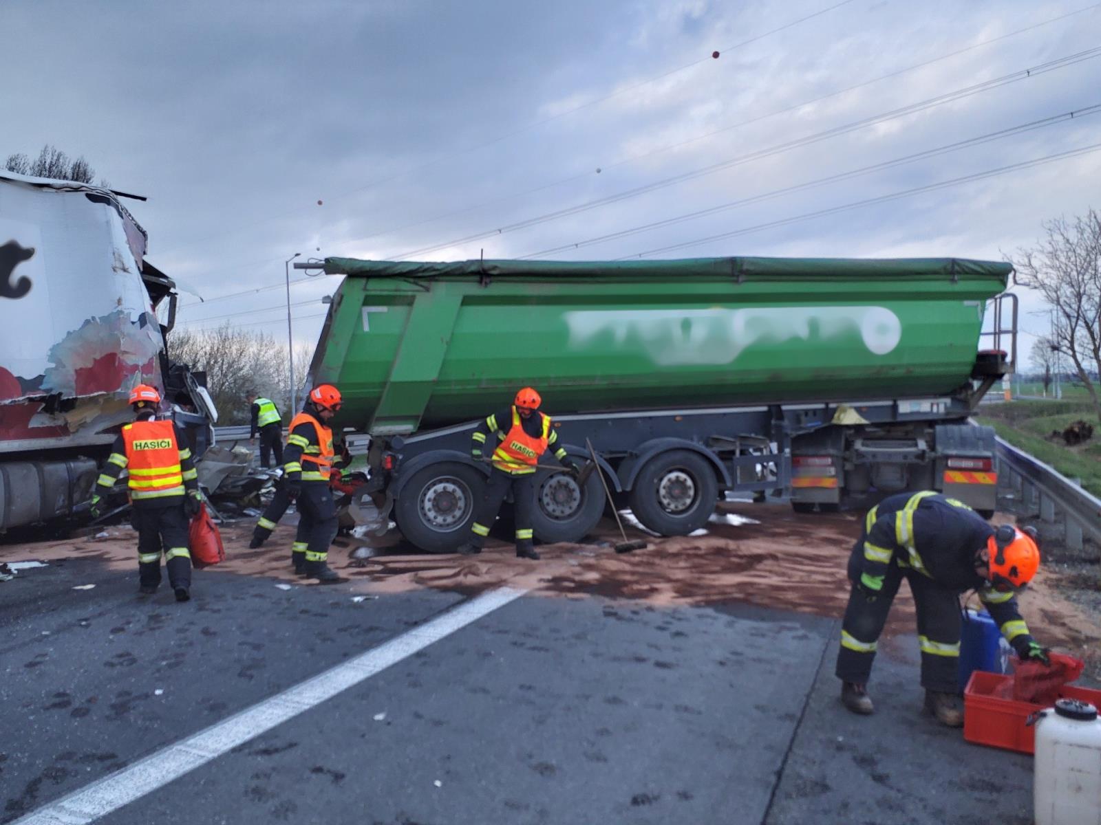 Při střetu došlo k poškození palivové nádrže jednoho z kamionů. Hasiči uniklou motorovou naftu zasypali sorbentem a zhruba 350 litrů přečerpali do připravených sudů.