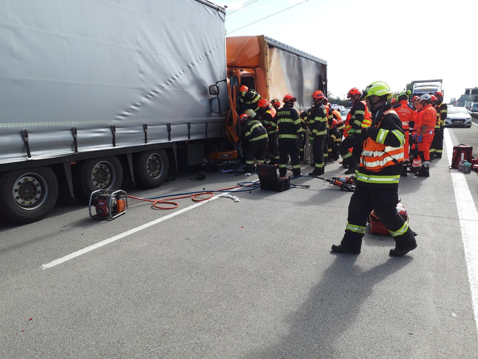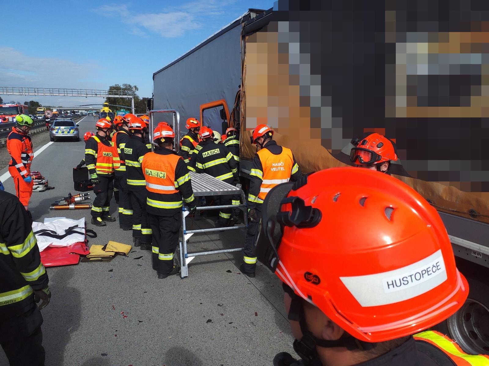 Hasiči zahájili vyprošťovací práce pomocí hydraulického zařízení. Provoz na Brno byl zastaven a směr na Bratislavu byl vzhledem k zasahující technice složek IZS omezený.