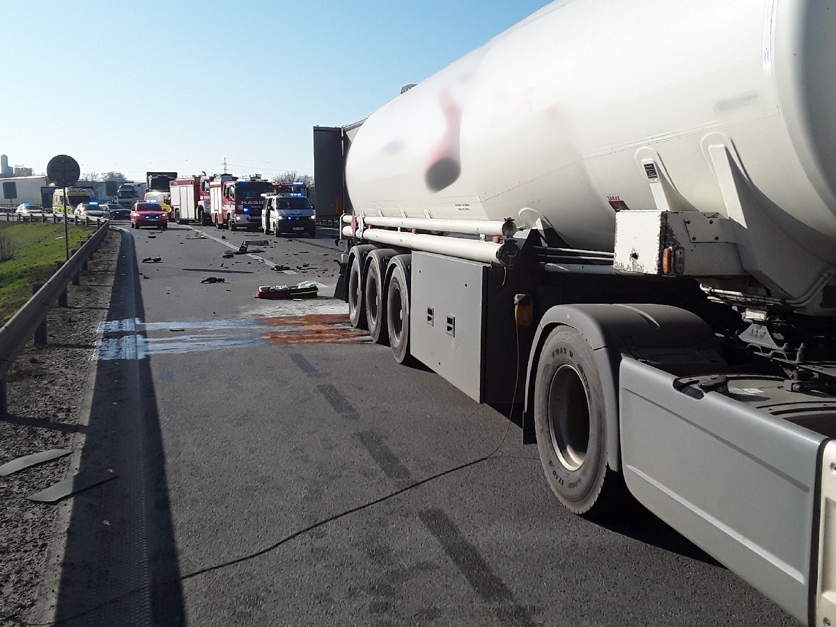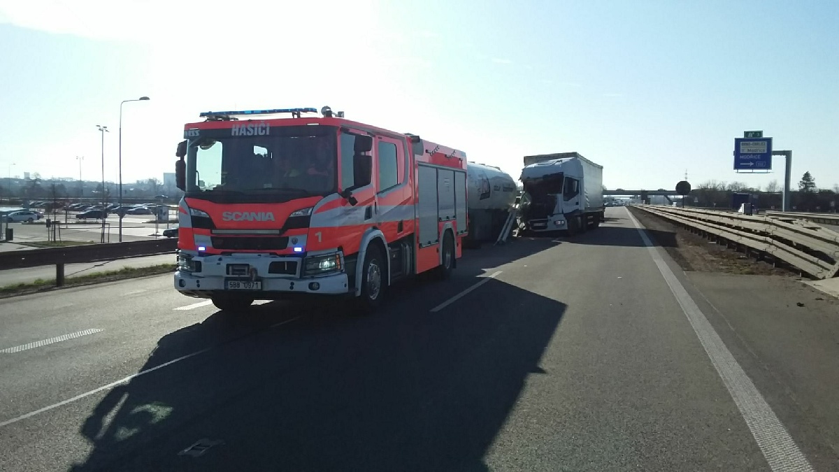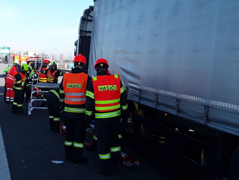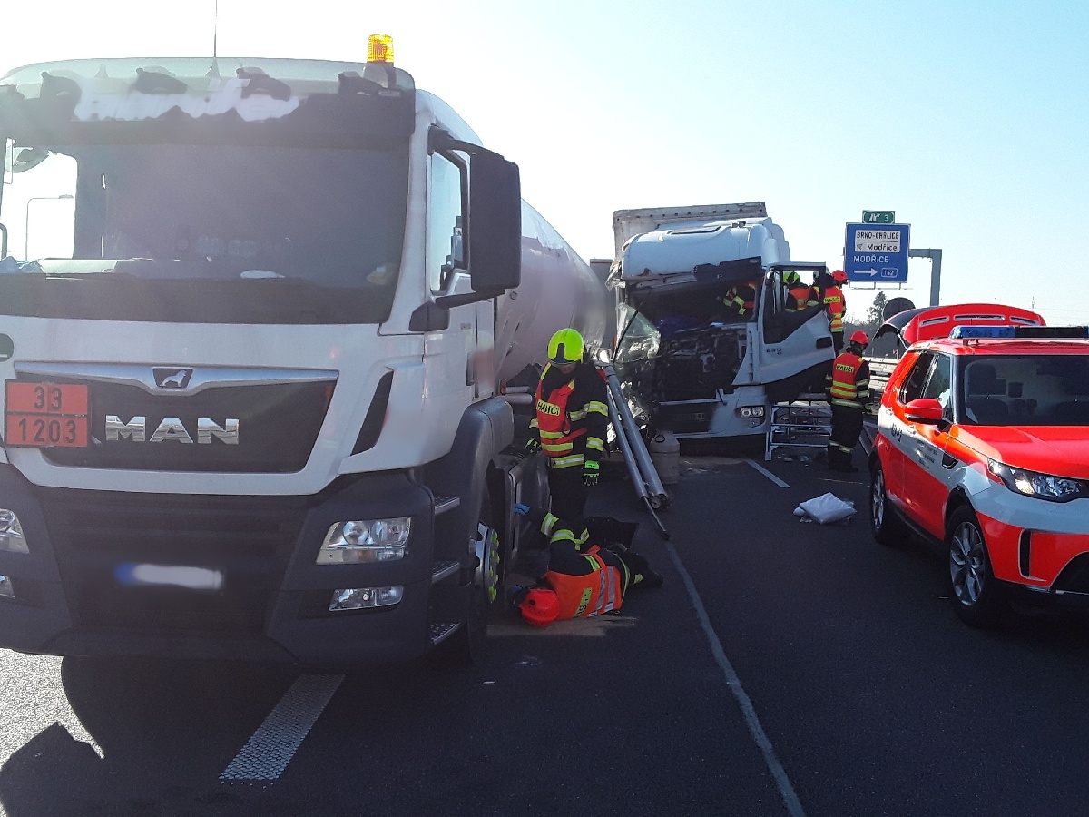 V 8.15 hod. jsme přijali informaci o nehodě dvou kamionů na D2 ve směru na Brno. Operační středisko k nehodě vyslalo tři profesionální hasičské jednotky. Kousek za sjezdem na 3. kilometru se srazila cisterna s kamionem. Jeden z řidičů byl v kabině zaklíněn a bylo nutné jej vyprostit. Následně skončil v péči záchranné služby. Hasiči zasypali uniklé provozní kapaliny a zajistili místo proti požáru. Doprava na dálnici směr Brno byla zastavena a policie provoz odkláněla na sjezdu před nehodou.