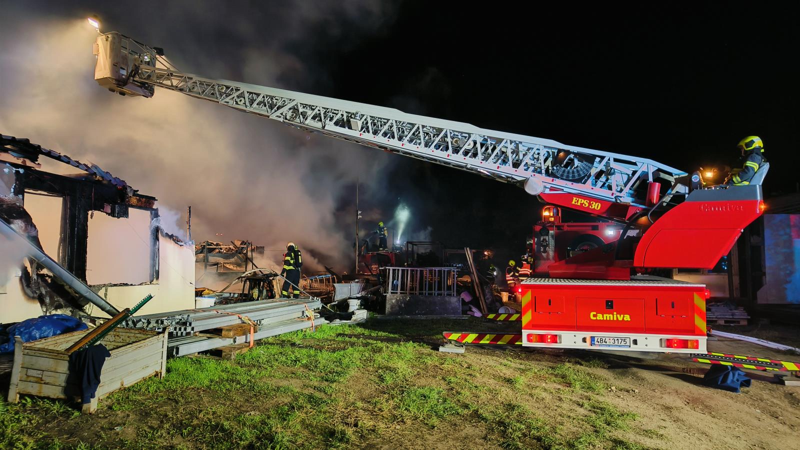 Operační středisko vyhlásilo druhý stupeň požárního poplachu. Na místo se postupně sjelo deset jednotek. Do boje proti plamenům hasiči nasadili sedm vodních proudů. Oheň dostali pod kontrolu v 0.52 hodin. Hasiči vyhledávali skrytá ohniska pomocí termokamery a dronu a následně je dohašovali. Z prostoru požáru postupně vynesli 10 PB lahví. V 3.58 hodin byl požár zcela zlikvidovaný.