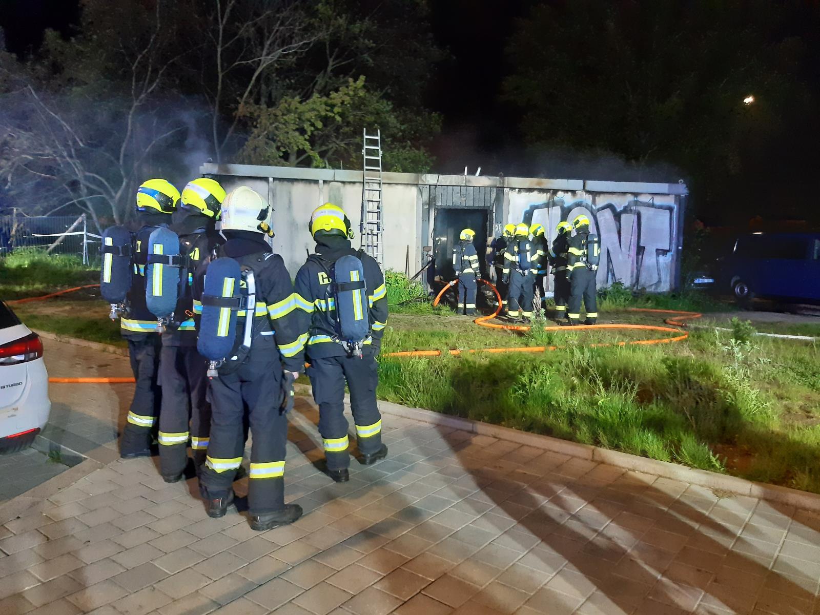 Krátce před půl třetí ráno jsme vyslali jednotky k nahlášenému požáru na ulici Plotní v Brně. První jednotka dorazila na místo za necelé 4 minuty od výjezdu ze základny. V té době byl již objekt složený z několika spojených unimobuněk celý v plamenech.