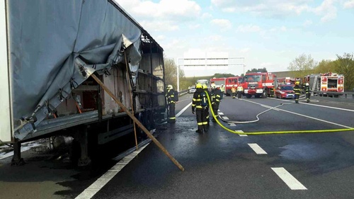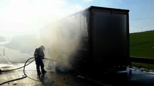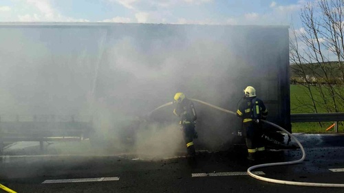 Před sedmnáctou hodinou zasahovali hasiči 19.dubna 2018 na dálnici D1 u Exitu 203. Operační středisko vyhlásilo druhý stupeň požárního poplachu. Hořel návěs kamionu. Provoz ve směru na Brno se zastavil a v opačném směru byl částečně omezen.