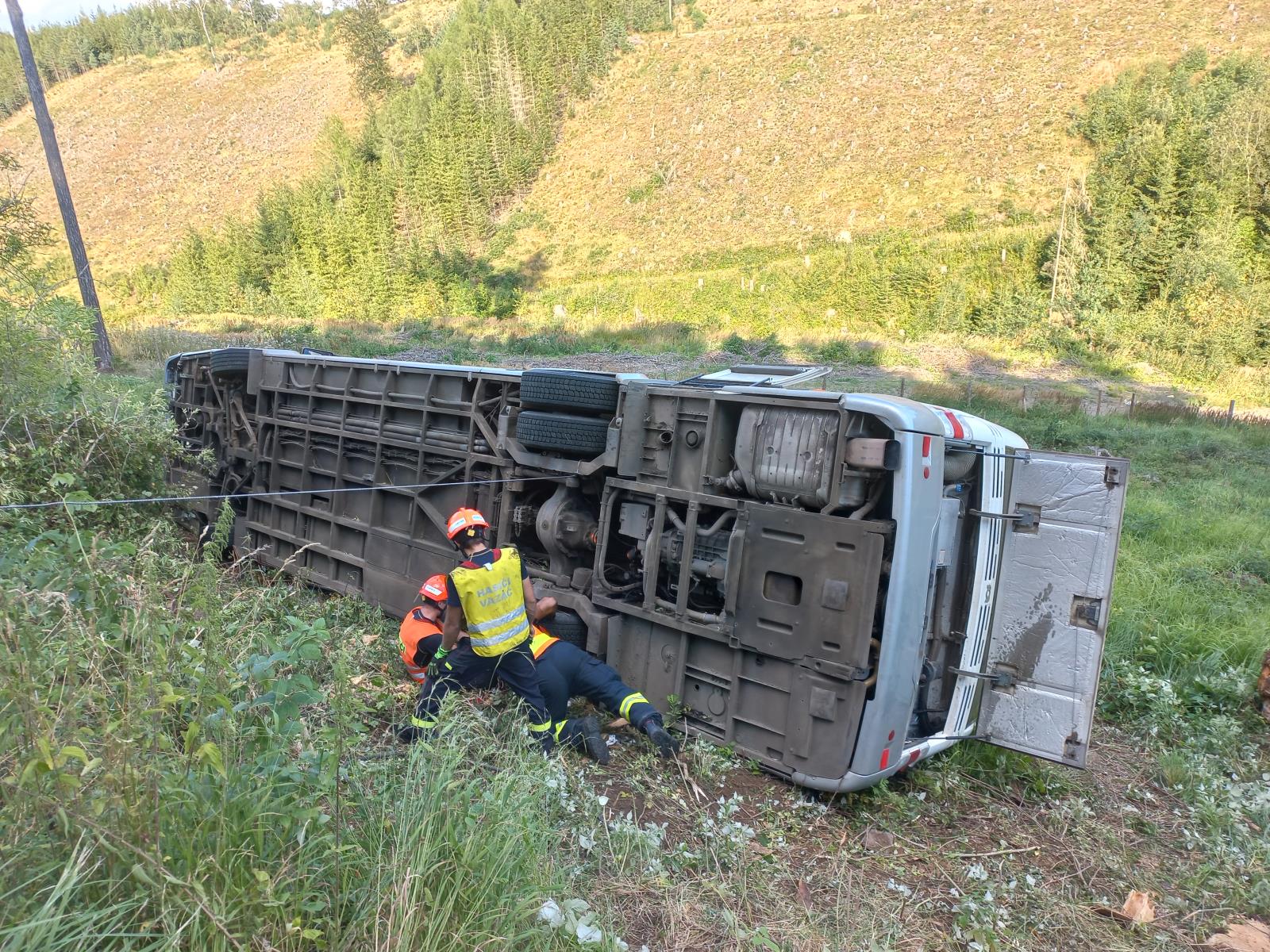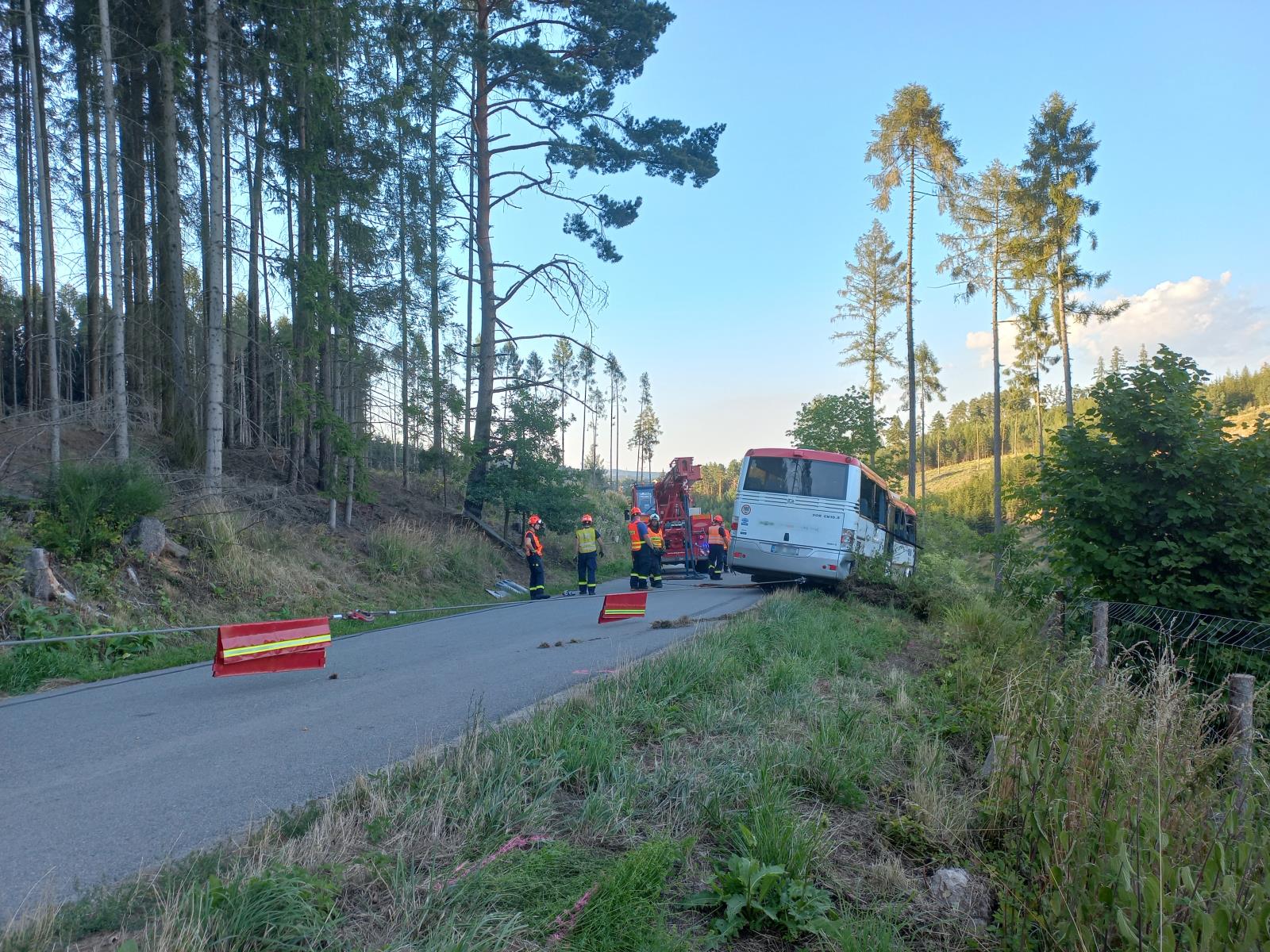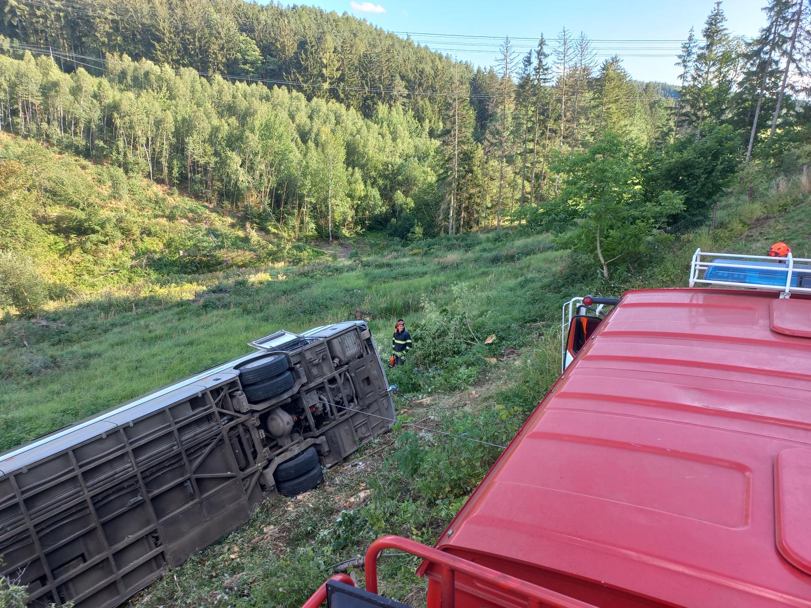 V autobuse, který sjel mimo vozovku a převrátil se na pravý bok, zůstali uvěznění dva cestující a řidič.