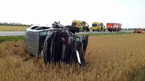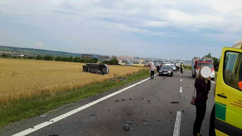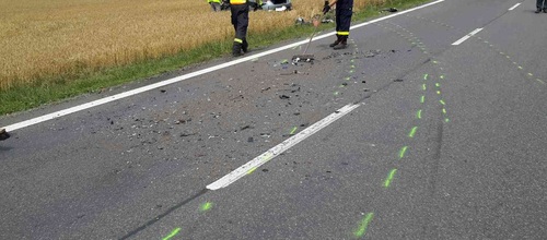 Osobní vůz skončil po nehodě na boku v poli. Hasiči zajistili místo nehody a asistovali záchranné službě při smrt.jpgošetřování celkem čtyř zraněných osob. Zraněná řidička motocyklu i přes maximální snahu všech zasahujících na místě svým zraněním podlehla.