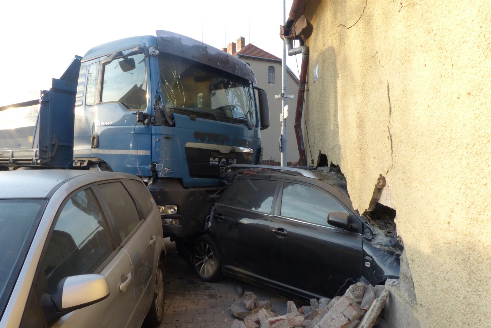 Hasiči na místě zjistili, že nákladní automobil narazil do dvou zaparkovaných osobních automobilů, přičemž jeden z nich prorazil zeď rodinného domu. Uvnitř domu byl zraněn jeho obyvatel, kterého si převzala do péče posádka záchranné služby.