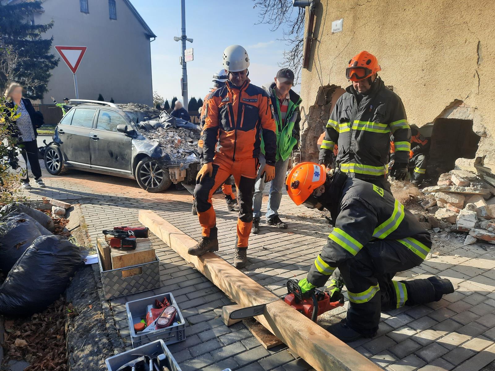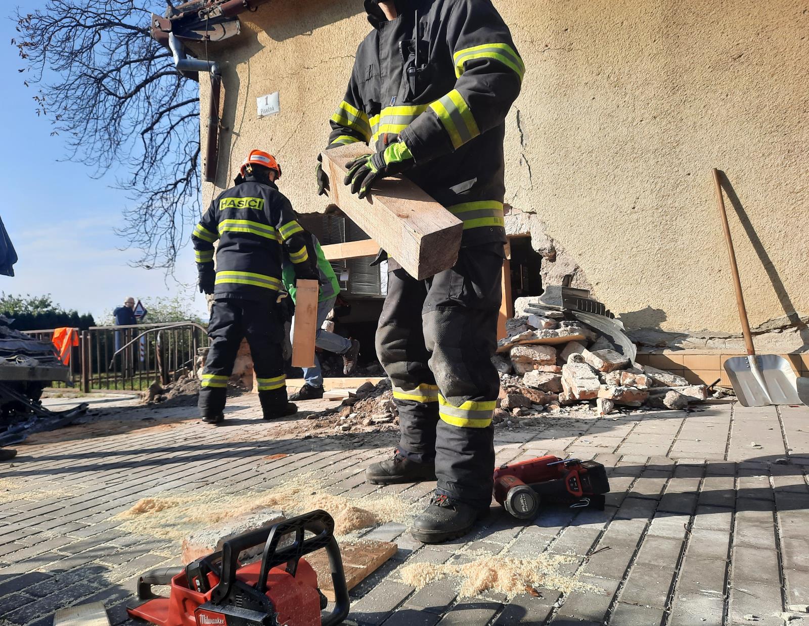 Hasiči zajistili havarované vozy proti vzniku požáru, zasypali uniklé provozní kapaliny a ke konzultaci zajištění poškozeného domu přivolali statika.
