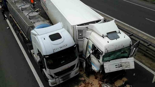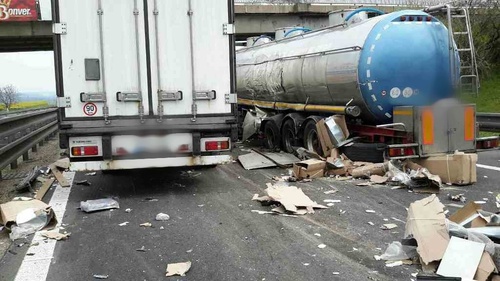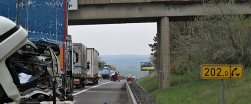 První nehoda se stala po 8. hodině ráno na 203. km. Nákladní vůz se převrátil a zůstal ležet na střeše mimo dálnici. Na místě jsme nemuseli nikoho vyprošťovat. Posádka byla při našem příjezdu mimo kabinu a skončila v péči ZZS. Hasiči zajistili místo proti požáru a přečerpali z nádrže havarovaného auta naftu. Dálnice zůstala s omezením průjezdná.