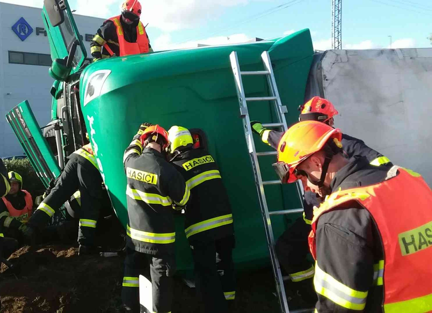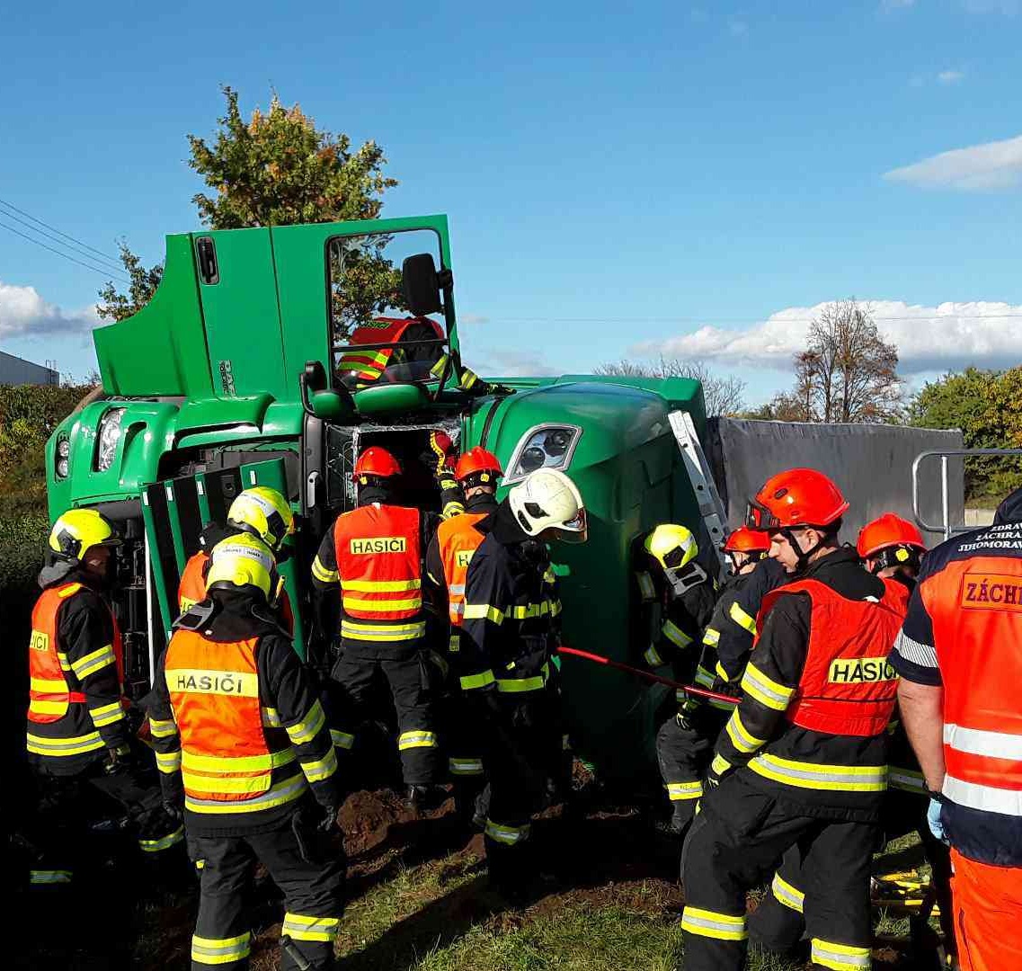Dnes odpoledne jsme vyslali čtyři profesionální hasičské jednotky k nehodě kamionu na 8. kilometru D52 ve směru z Brna. Nákladní vůz se převrátil na bok a uvnitř byl zaklíněný řidič. Hasiči museli pomocí ženijního nářadí odkopat nahrnutou hlínu kolem kabiny a následně řidiče za 20 minut po příjezdu první jednotky z kabiny vyprostili. Hasiči na místě nehody zasahovali od 15.25 do 15.58 hodin. Doprava na dálnici byla během zásahu omezena.