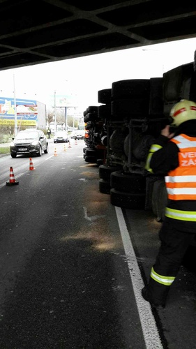 Nákladní automobil převážející bagr se převrátil pod železničním mostem. Hasiči na místě zjistili, že posádka je bez zranění a nebylo nutné nikoho vyprostit. Ze soupravy neunikaly žádné provozní kapaliny.