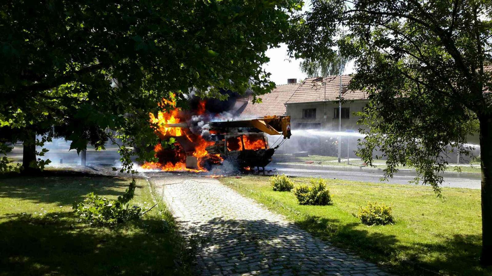 Náročný zásah mají za sebou hasiči, kteří zasahovali po třinácté hodině u požáru automobilového jeřábu v Kozlanech na Vyškovsku. Při příjezdu hasičů byl jeřáb celý v plamenech. Vlivem požáru postupně vybouchly všechny pneumatiky na voze a odlétly několik metrů daleko. Požár poškodil elektrické vedení u silnice a hrozilo zranění elektrickým proudem. Hasiči museli počkat, až energetici vypnou elektrický proud v obci, aby mohli začít účinně hasit.