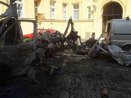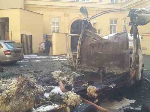 Dnes 28.9. 2017 odpoledne vyjely naše tři jednotky k požáru dodávky ve vnitrobloku v Brně na Moravském náměstí. Výbuch tlakové lahve zcela zničil dodávku a způsobil škody přes milion korun. Dva muži se zranili.