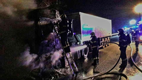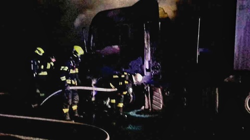 V pátek krátce před sedmnáctou hodinou vyjely profesionální a dobrovolné jednotky hasičů k požáru tahače na D1 u Šlapanic. Na požárem zasaženou kabinu kamionu nasadili hasiči několik vodních proudů a tím uchránili návěs i s nákladem řepy.