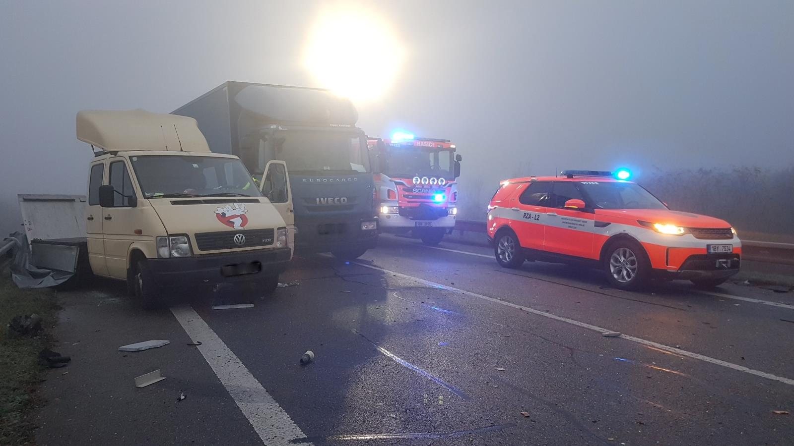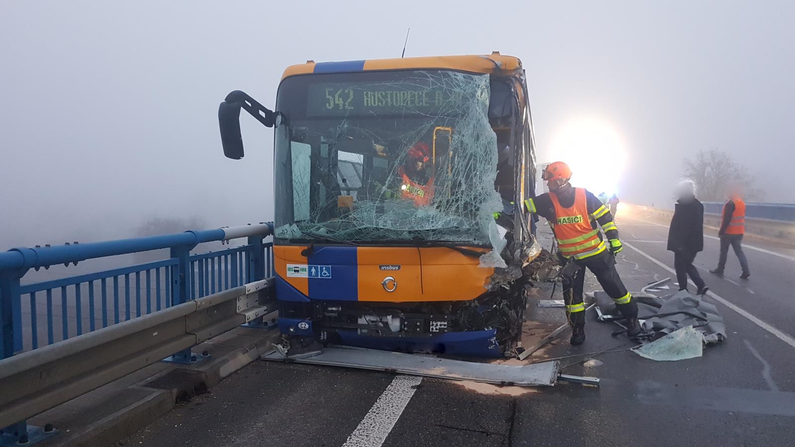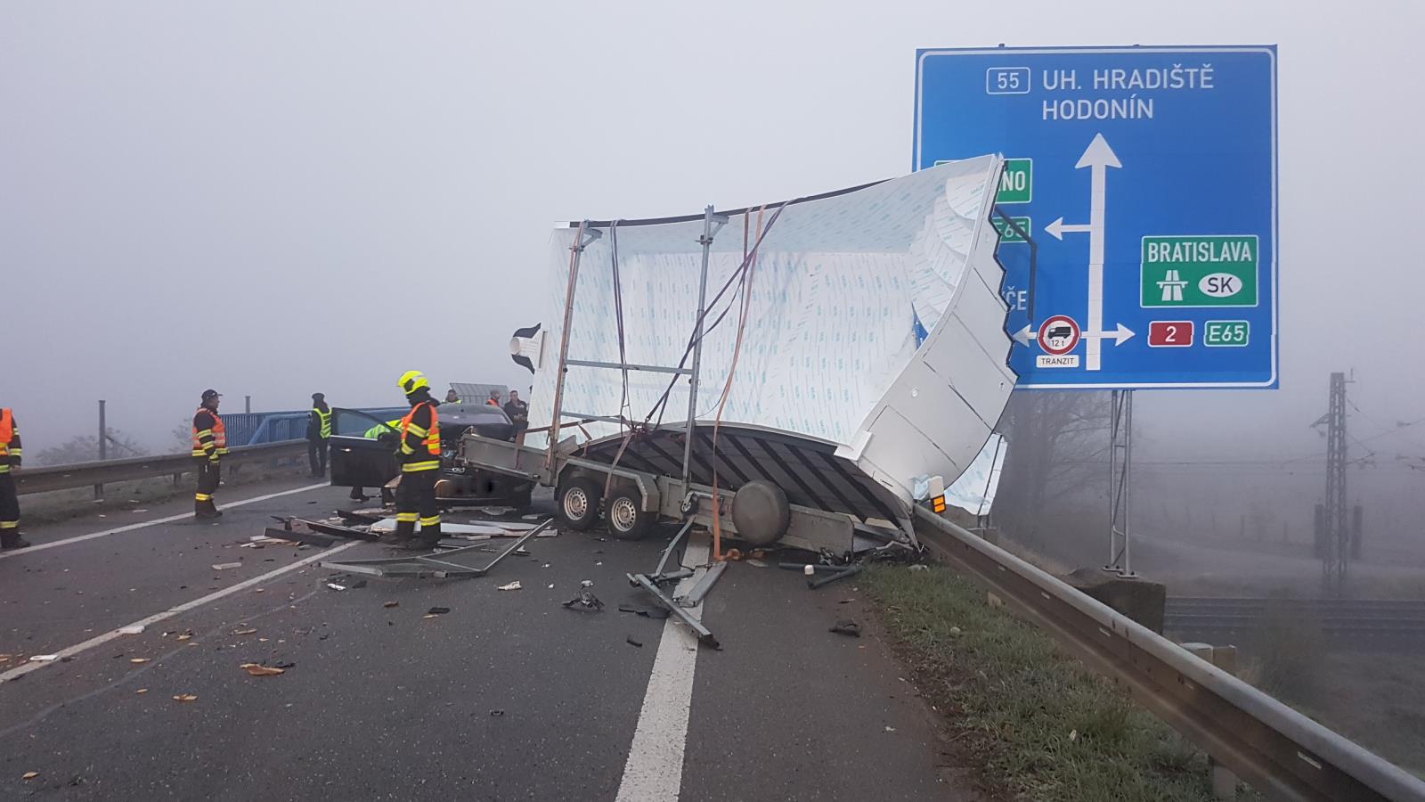 Dvě jednotky krátce po půl šesté ranní zasahovaly u dopravní nehody autobusu, osobního auta a dodávky s přívěsem na silnici I/55 u Břeclavi. Z osobního auta vyprostily řidiče. V autobuse cestovalo 5 lidí. Hasiči je spolu s řidičem vyprostili přes okna, dveře byly zablokovány svodidly. Celkem se zranilo 6 lidí. Silnice byla po celou dobu zásahu uzavřena.