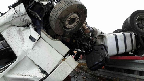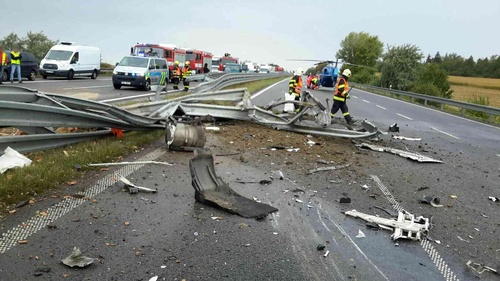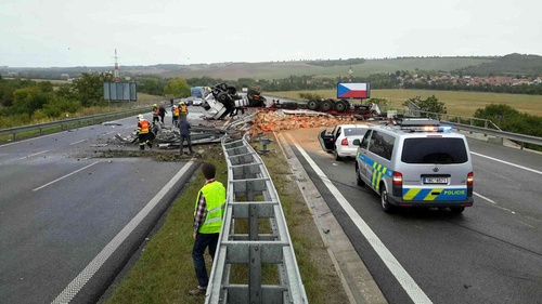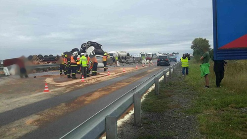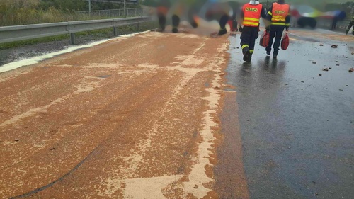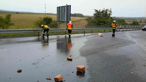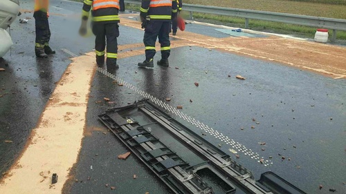 Z kamionu, který prorazil středová svodidla a převrátil se na bok, vyteklo na komunikaci asi 250 litrů pohonných hmot, které zasahující hasiči zasypali sorbentem. Dalších 150 litrů nafty hasiči zachytili do speciální nádoby.