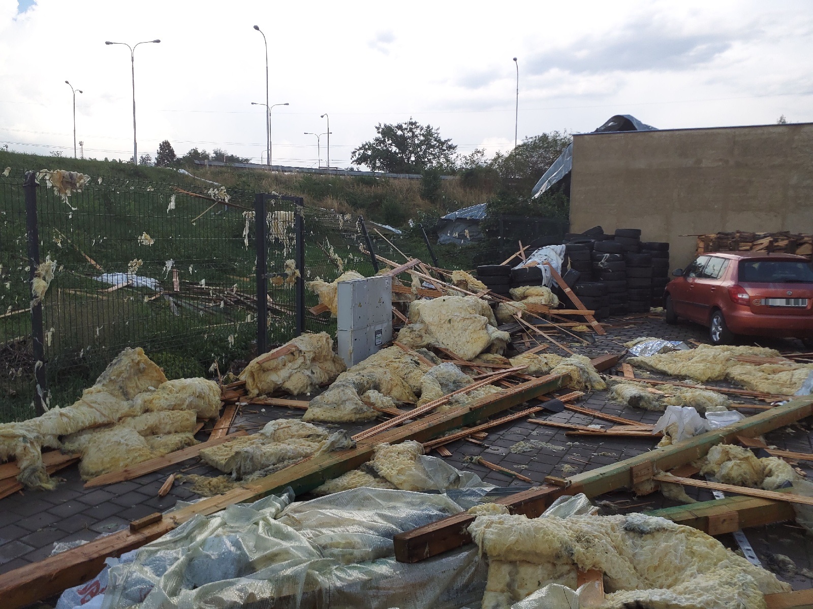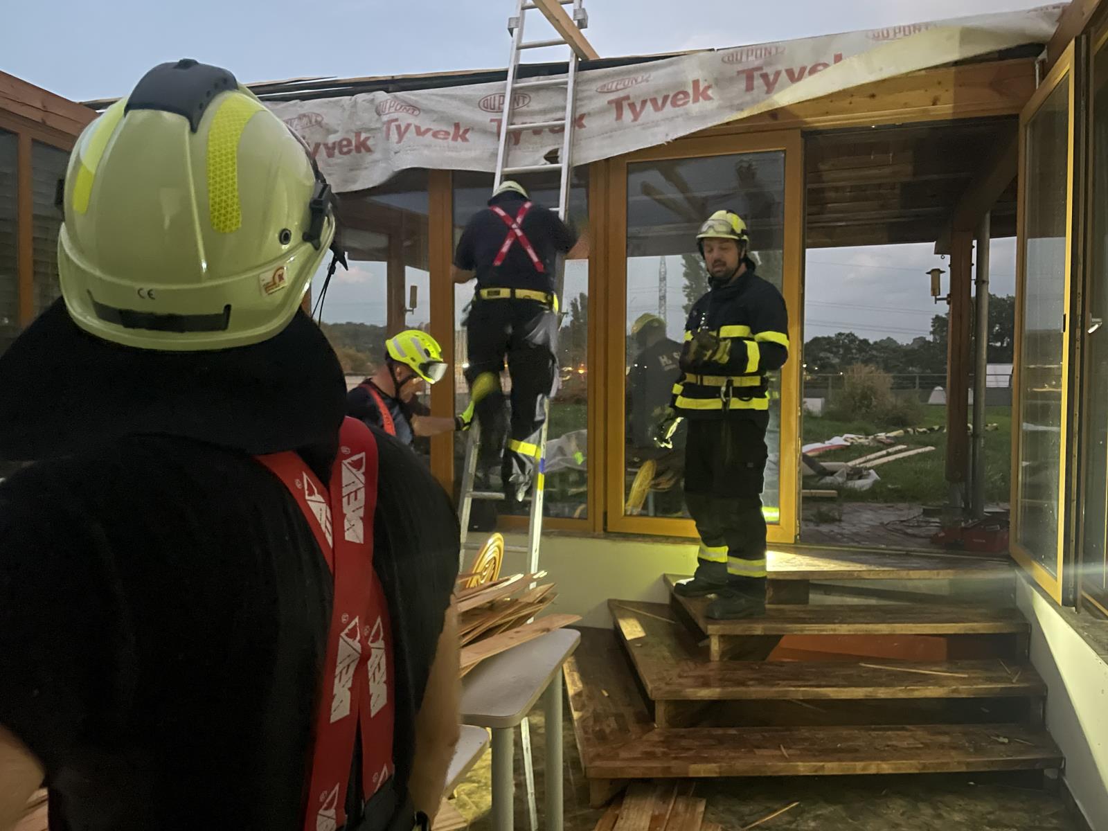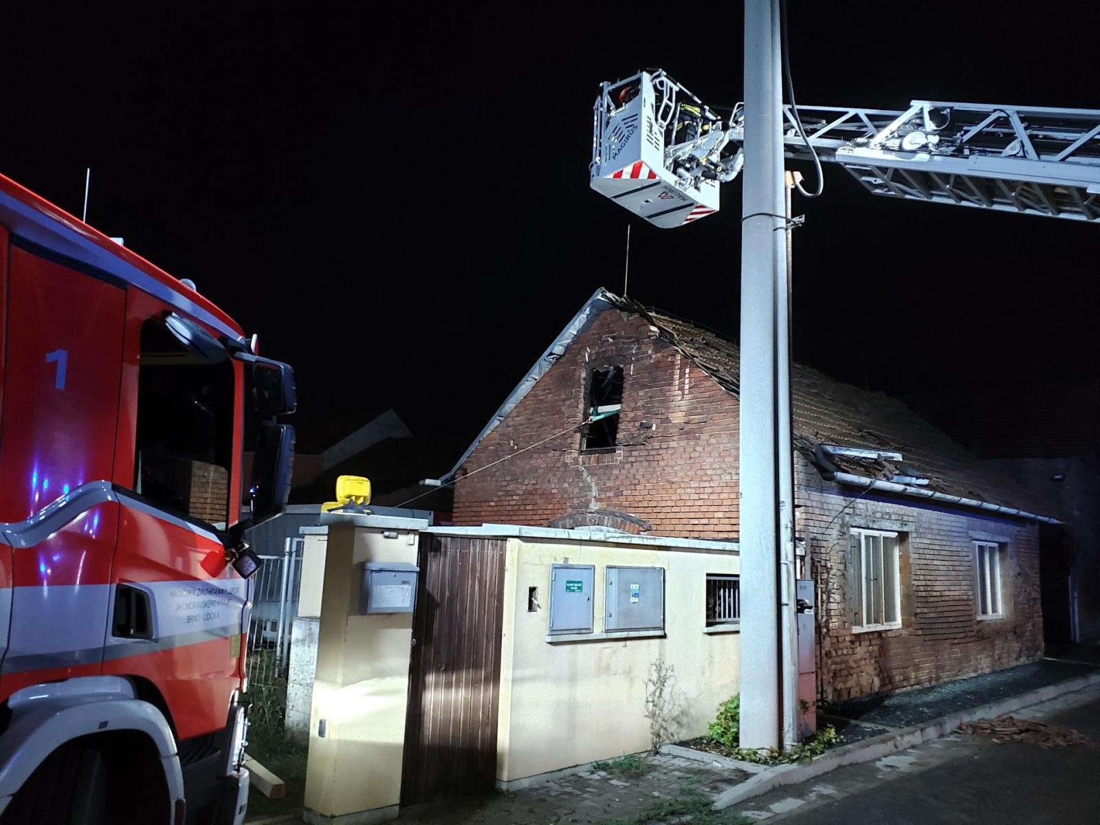 Velké škody napáchala bouřka na území Brno-Jih, kde jsme zasahovali nejvíce. Na ulici Hájecká došlo k utržení střechy z firemního objektu a tato střecha poté poškodila další okolní stavby v okolí. V celé této oblasti jsme evidovali mnoho popadaných stromů, jak na komunikaci, tak i na zaparkovaná vozidla. Pomocí kontejneru s pohotovostním dřevem jsme započaly práce na provizorní opravě poškozené střechy budovy. Spolu s dobrovolnými jednotkami jsme provedli i zajištění plachtou, tak aby nedošlo k dalšímu poškození majetku. Na ulici Ráječek hasiči s výškovou technikou zabezpečili padající štít jednoho z rodinných domů. Postupně se nám podařilo štítovou zeď rozebrat do bezpečného stavu. Na obou místech jsme využili spolupráci se statikem, který jednotlivé budovy zkontroloval.