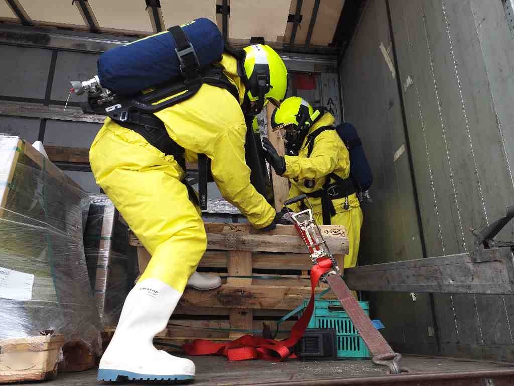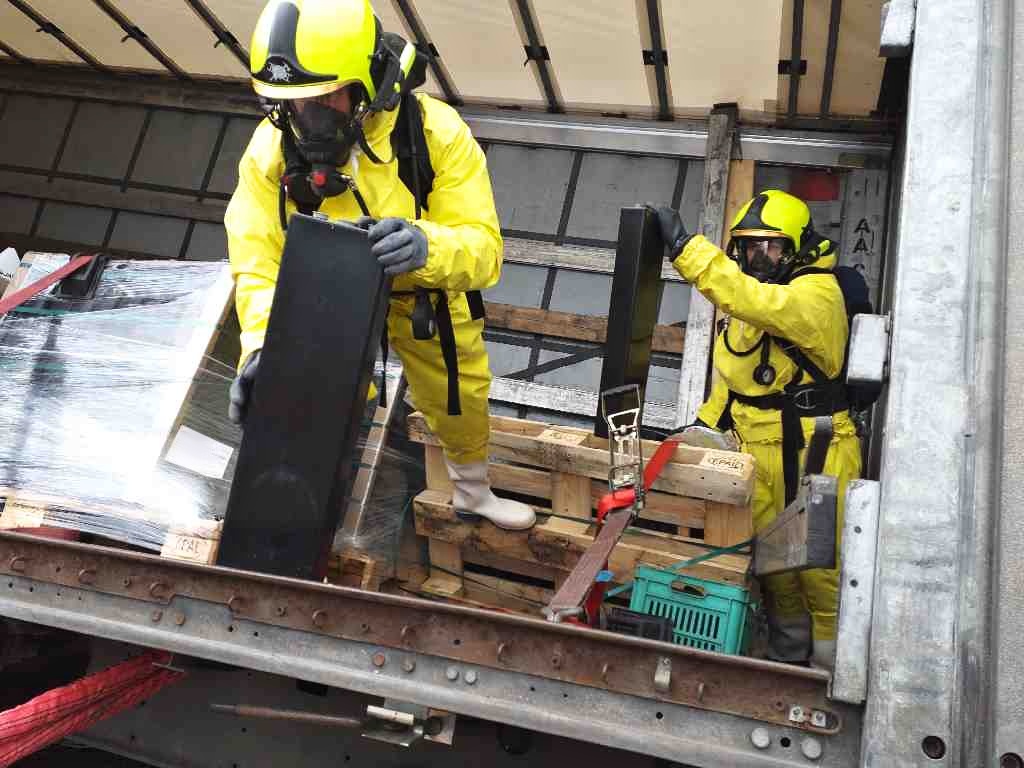 Z některých akumulátorů unikal elektrolyt, ten hasiči zachytávali do připravených nádob. Návěs proti dalšímu nežádoucímu pohybu zajistili a ve speciálních ochranných oblecích a dýchací technice zamezili uvnitř návěsu dalším únikům.