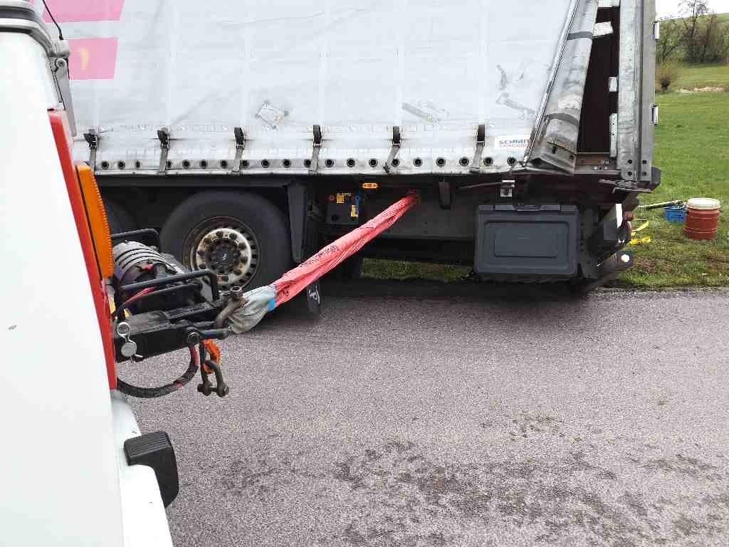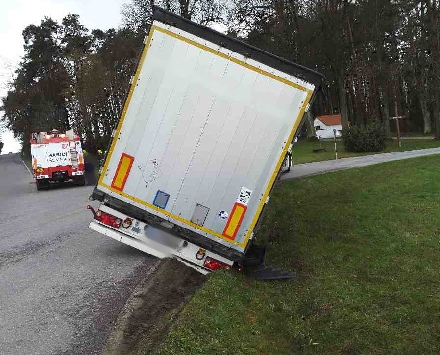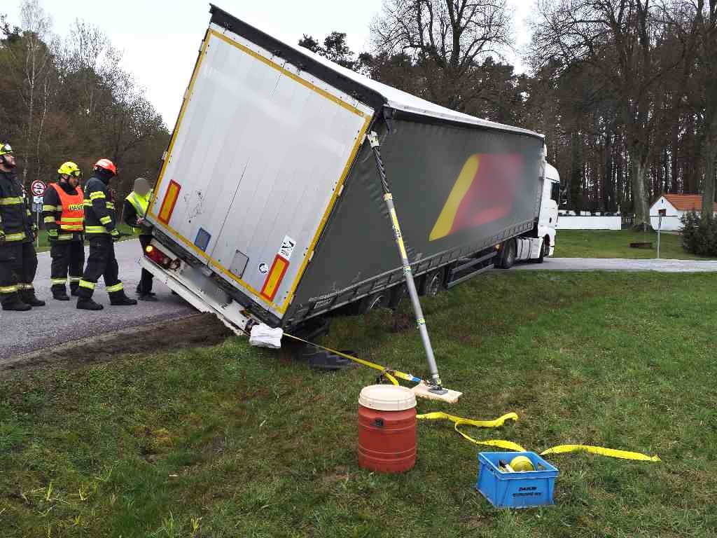 Za využití navijáků ze dvou vyprošťovacích automobilů vyprostily jednotky havarovanou soupravu zpět na silnici před sedmnáctou hodinou. Nehoda se obešla bez zranění.