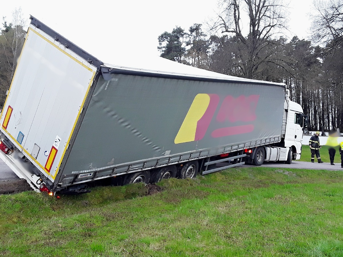 Sobota, 15. dubna 2023 –  Odpoledne jhasiči vyjížděli k obci Podmyče k nehodě nákladního automobilu. Souprava, která převážela akumulátory, zde částečně sjela mimo komunikaci a hrozila převrácením.