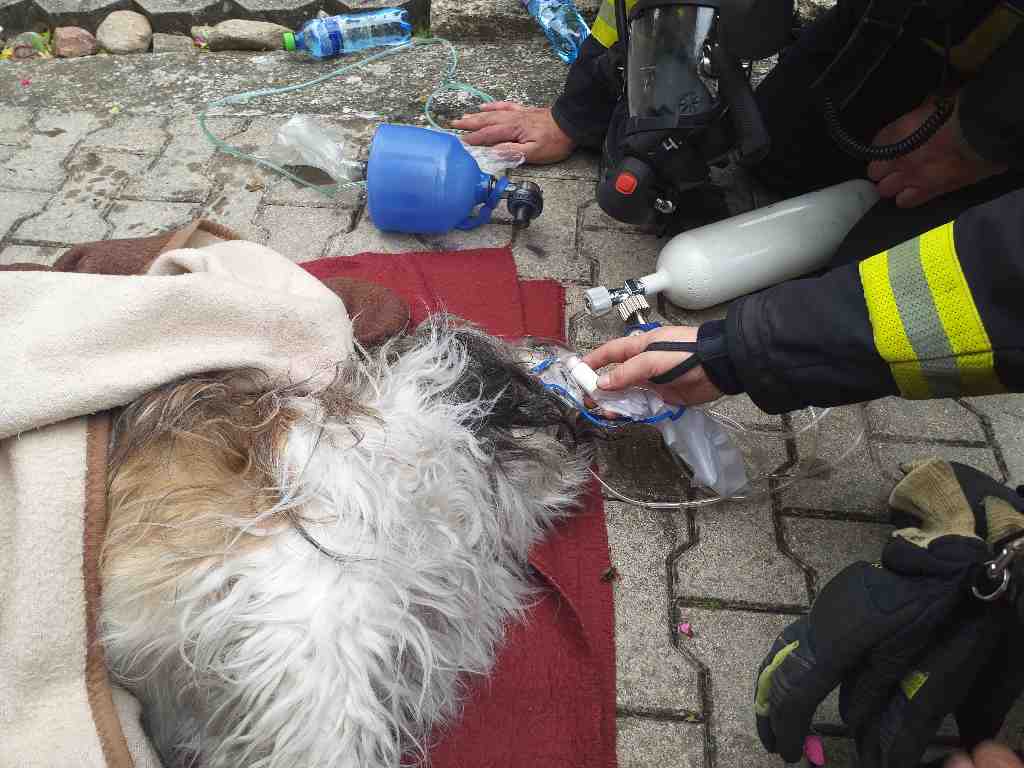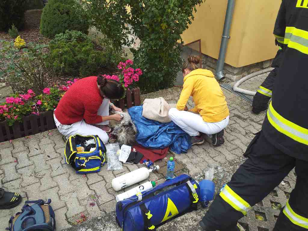 Následně se podařilo v objektu vyhledat také psa. Hasiči mu poskytli kyslíkovou terapii a velitel zásahu si přes operační středisko nechal na místo povolat veterinářku. Pes skončil v její péči.