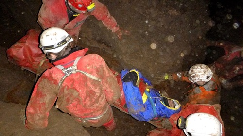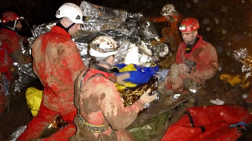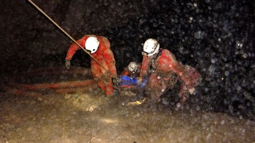 Lékař speleologické záchranné služby zajistil nezbytnou péči zraněnému již v jeskyni. Kolem půl páté se s využitím speciální stabilizační sady Paratech podařilo zraněného muže vyprostit a následně mohl být přesunut do tepelného stanu. Po jeho vyšetření a přípravě zahájili speleologičtí záchranáři a hasiči ve čtvrt na šest cestu z jeskyně. Zraněného se podařilo náročným jeskynním komplexem vynést ven krátce před šestou hodinou. Okamžitě se dostal do péče posádky ZZS, která na místo vyslala také vrtulník.