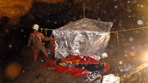 Hasiči z lezecké skupiny a speleologičtí záchranáři se soustředili jak na vyproštění muže, tak také na přípravu a zajištění cesty pro následný transport pacienta z jeskyně. Uvnitř jeskyně postavili tepelný stan určený pro ošetření a přípravu zraněného na transport z jeskyně. Současně využili pro komunikaci nové komunikační zařízení Nikola, které umožňuje radiově vysílat několik desítek metrů pod zem.