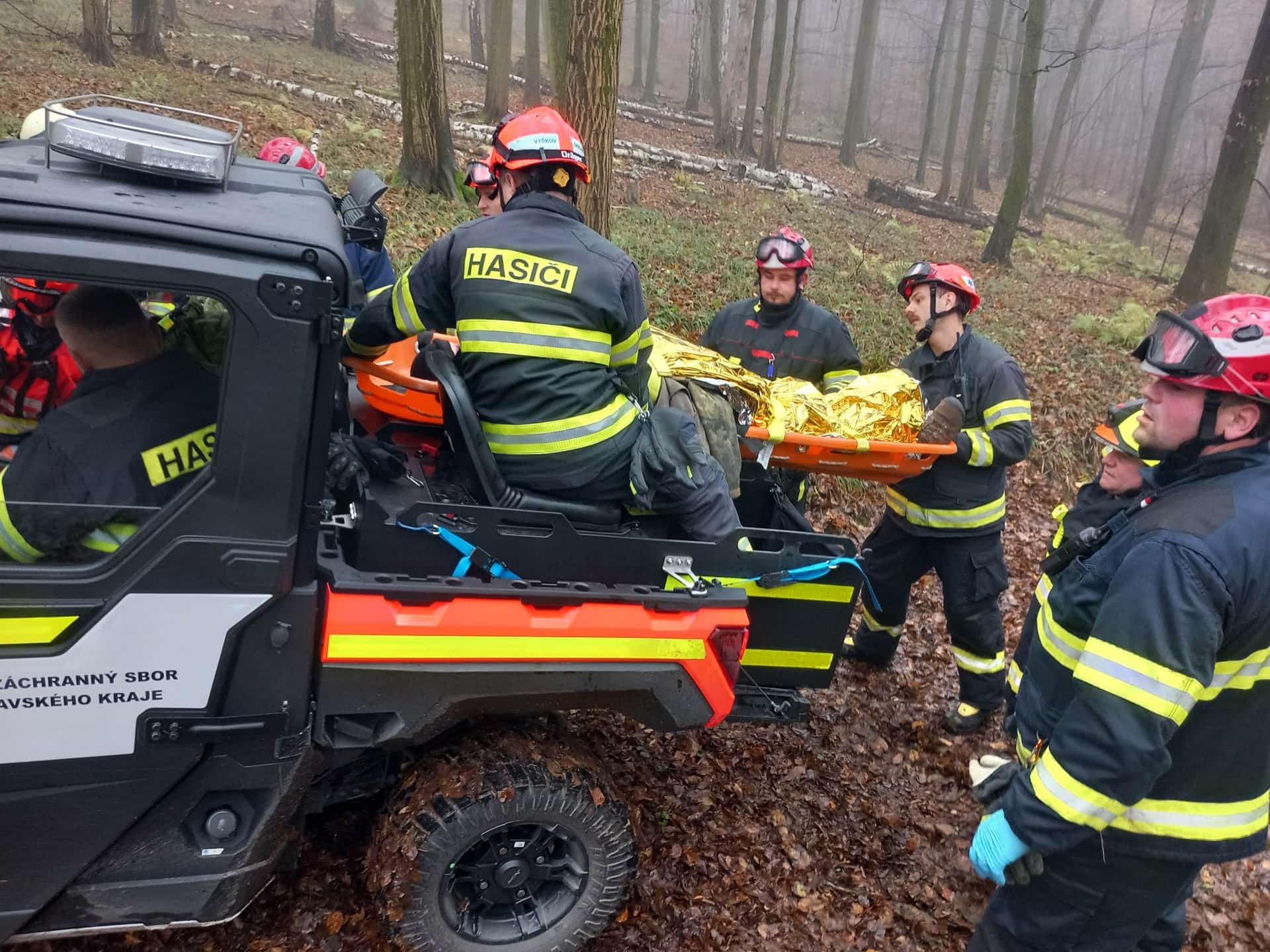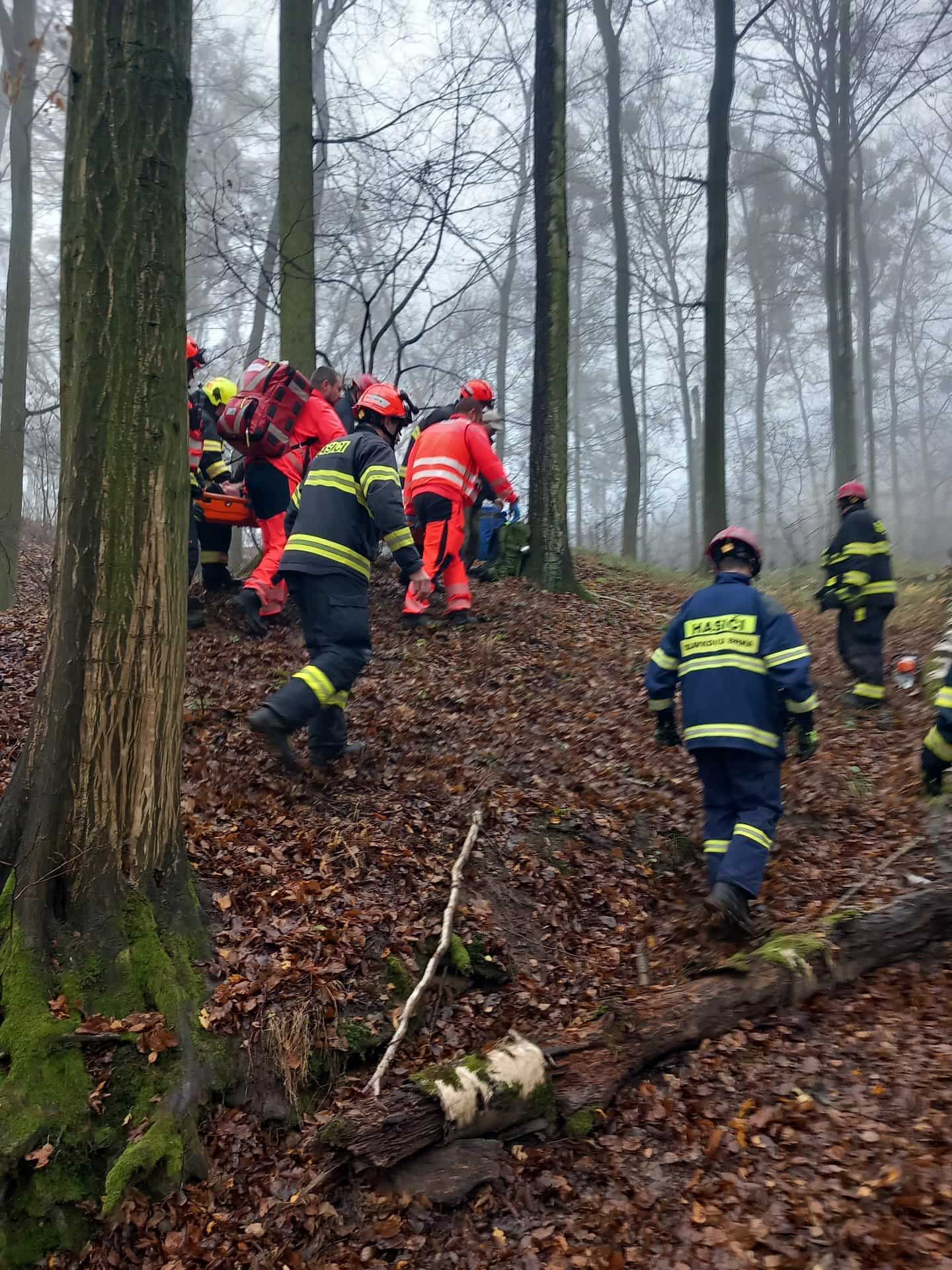 Záchrana v lese: Hasiči s posádkou záchranářů spojili síly při náročném transportu