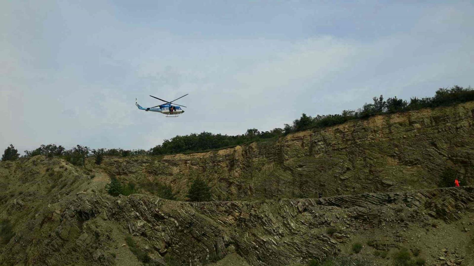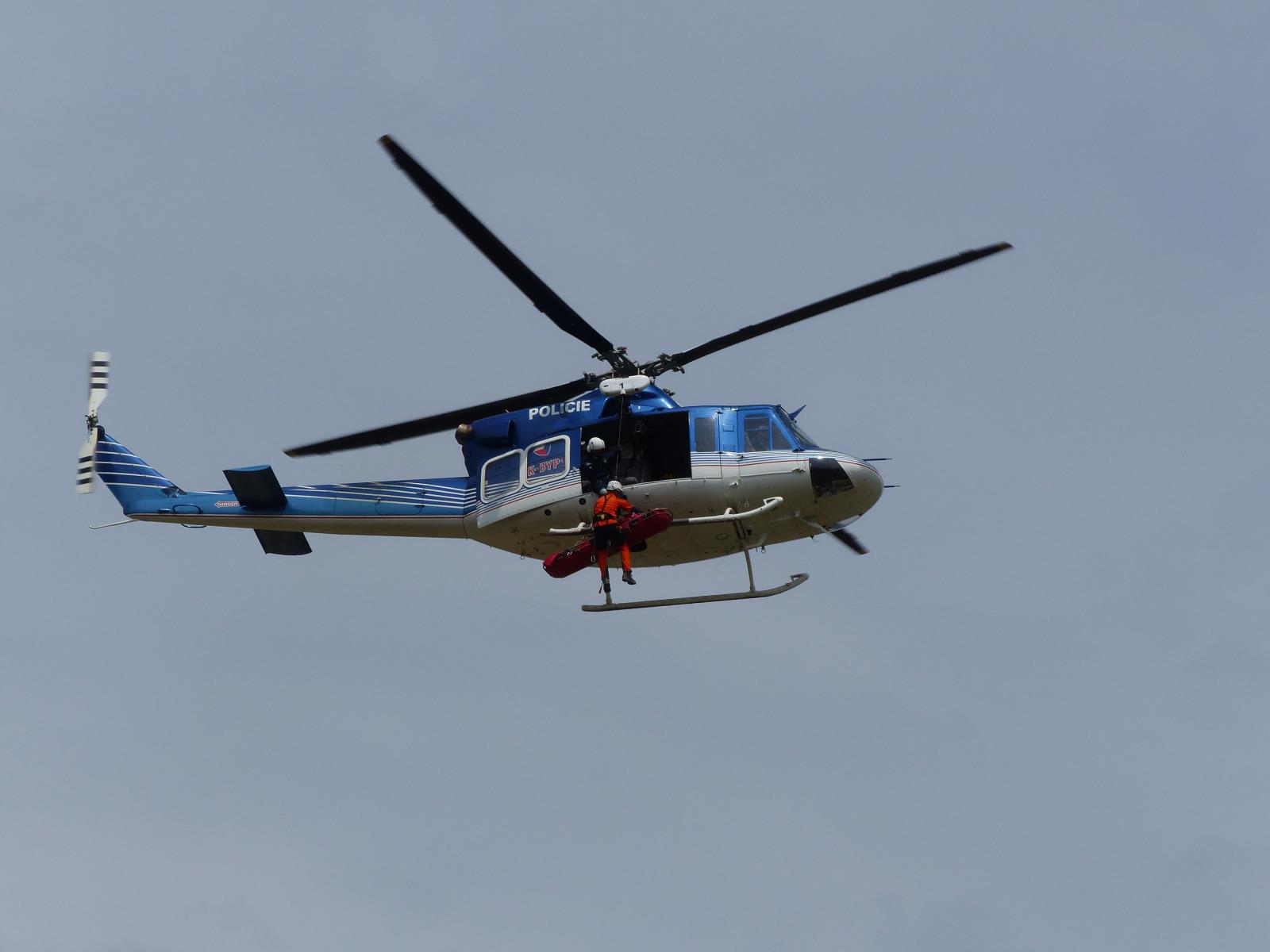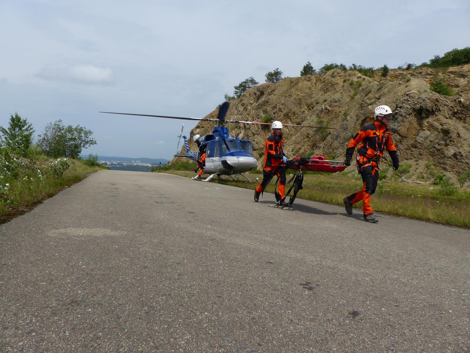 Jakmile záchranáři v lomu připravili zraněnou k transportu, přiblížil se vrtulník k místu a po úvazu nosítek do podvěsu pod vrtulník přepravil pacientku k sanitnímu vozu.