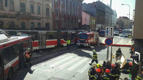 K vážné dopravní nehodě vyjížděli v pondělí odpoledne brněnští hasiči. Při střetu trolejbusu a tramvaje se zranilo čtyřicet osob. Ulice Křenová byla v místě nehody zcela uzavřena. Informaci o mimořádné události přijalo operační středisko hasičů krátce před čtrnáctou hodinou. Již první telefonáty na tísňovou linku informovaly o velkém počtu zraněných a zaklíněných cestujících. Operační důstojník vyslal k místu události profesionální jednotky ze stanic Lidická, BVV a Líšeň. Po příjezdu na místo nehody hasiči okamžitě započali s vyprošťováním celkem sedmi zaklíněných cestujících, kdy posledního zaklíněného cestujícího vyprostili za necelých dvacet minut od příjezdu první jednotky. Ve spolupráci se záchrannou službou zasahující jednotky dále třídily a ošetřovaly zraněné cestující z trolejbusu. V tramvaji byl v době nehody přítomen pouze její řidič, který se také při nehodě zranil. Cestující, jejichž zranění byla záchrannou službou vyhodnocena jako lehká, byli přesunuti do evakuačního autobusu, kde jim byla kromě lékařské péče poskytnuta posttraumatická intervenční péče příslušníky HZS. Evakuační autobus posléze převezl lehce zraněné cestující do brněnských nemocnic. V pozdních odpoledních hodinách hasiči dále spolupracovali se zaměstnanci dopravního podniku při odklízení následků nehody. Operační středisko hasičů zřídilo pro rodinné příslušníky zraněných cestujících infolinku (tel. č.: 950 649 999), kde jsou poskytovány základní informace o zraněných a v jakých nemocnicích jsou hospitalizováni. Zdroj: Filip Venclovský filip.venclovsky@firebrno.cz Foto: HZS Jihomoravského kraje FOTOGALERIE