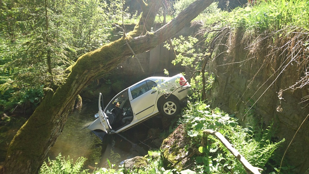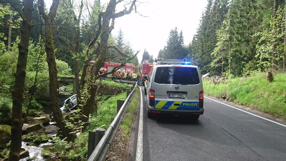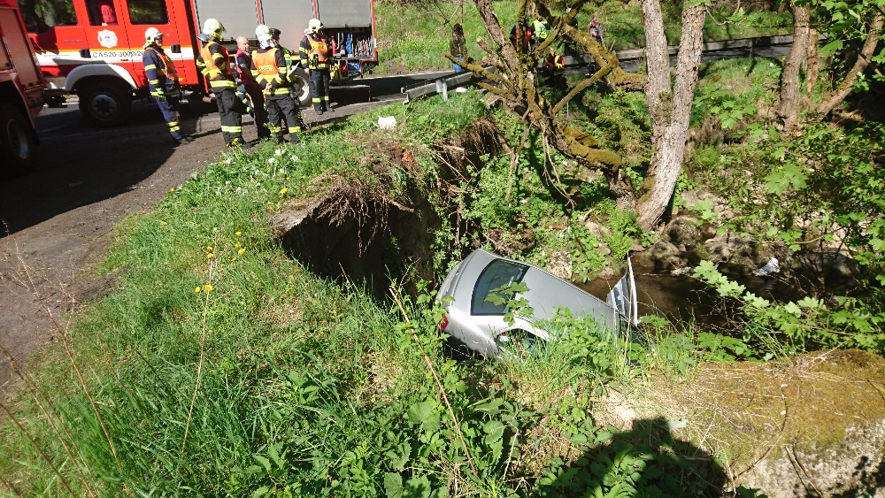 Mimo vozovku v potoce skončilo osobní auto po dopravní nehodě na silnici z Hroznětína na Pernink u Pstruží ve čtvrtek, 25.5.2017...