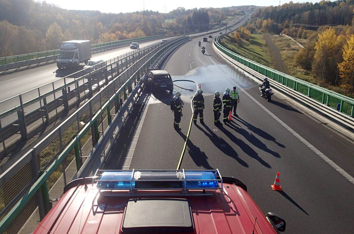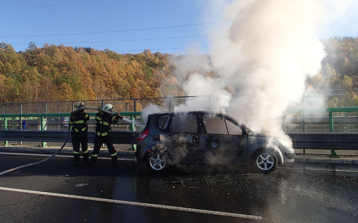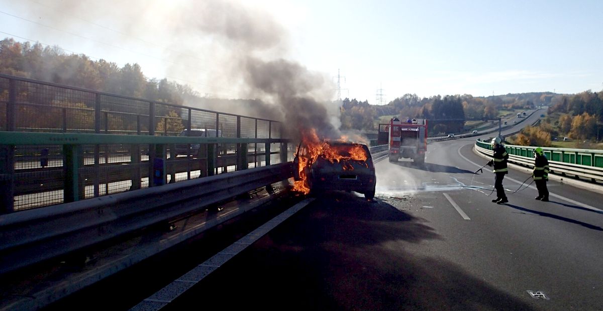 Auto začalo hořet za jízdy přímo na dálnici Kvůli požáru byl zcela zastavený provoz.