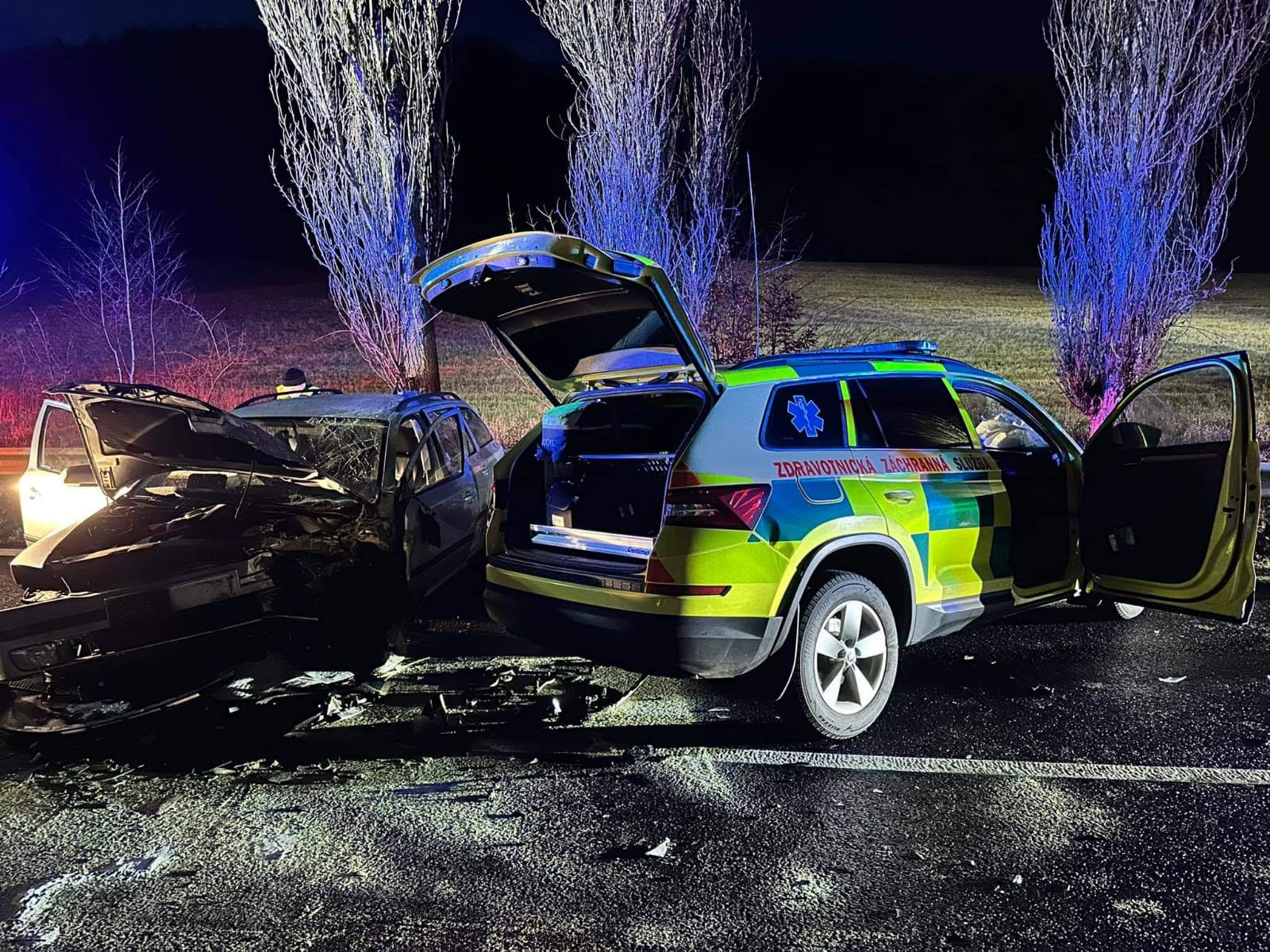 Tato druhá nehoda se stala na silnici I/13. Operační středisko hasičů vyslalo druhé družstvo ze stanice Karlovy Vary, druhé družstvo jednotky Ostrov a opět požádalo o pomoc kolegy z Klášterce. I k druhé nehodě byl povolaný vrtulník, operační středisko tak muselo podle závažnosti přesouvat jednotky v terénu. U nehody na silnici č. 13 se zranila posádka záchranářského vozidla a také osoba z druhého osobního auta. U původní nehody čtyřkolky byli první hasiči z Ostrova, ti potvrdili, že se jedná o převrácený stroj po nárazu do stromu, na místě byly dvě zraněné osoby.