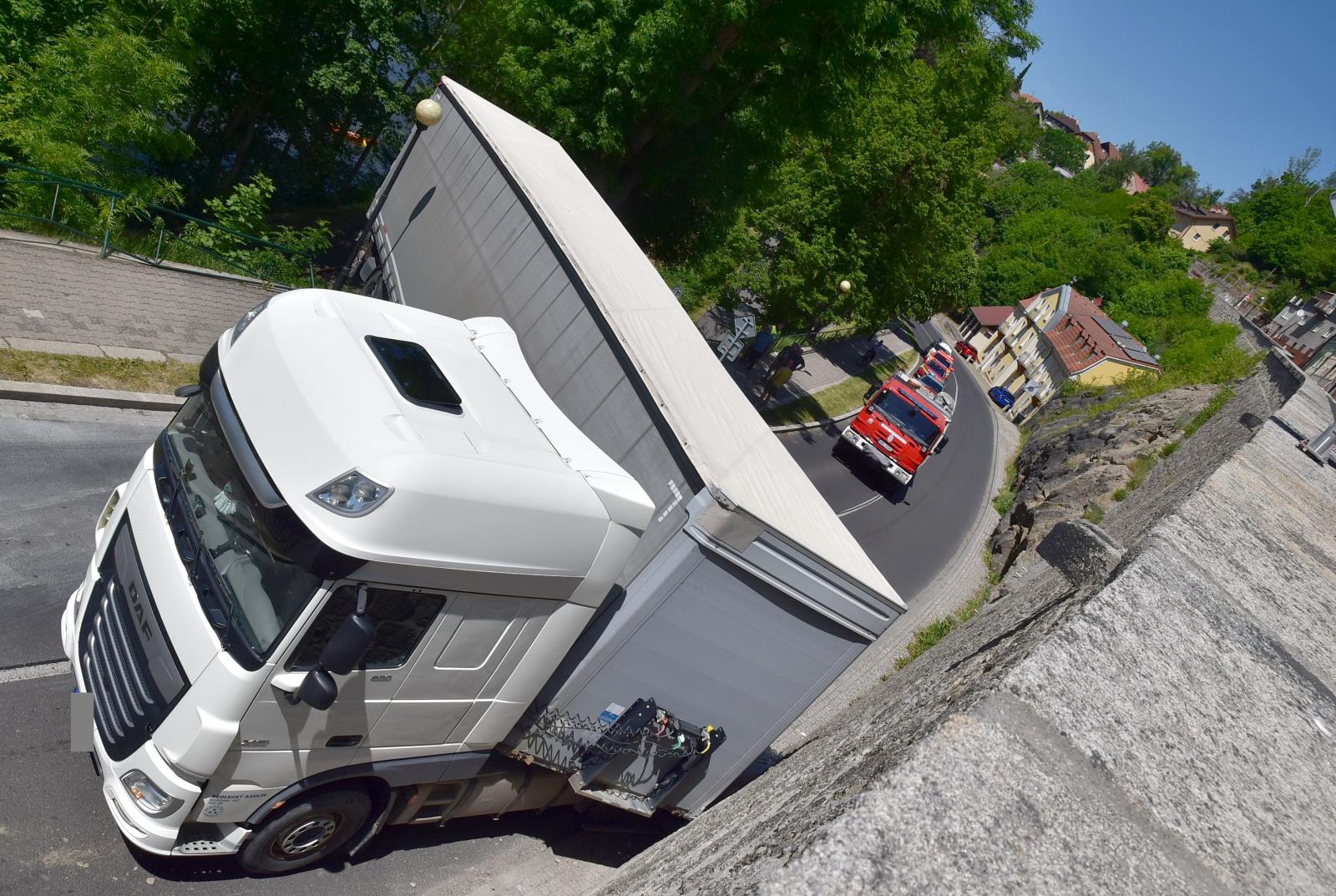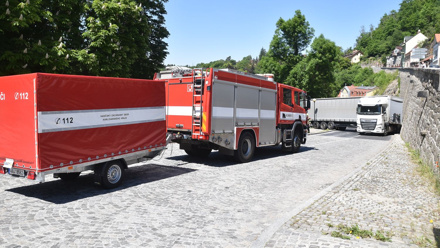Kamion blokoval provoz v Lokti, hrozil i pád vozidla na koleje