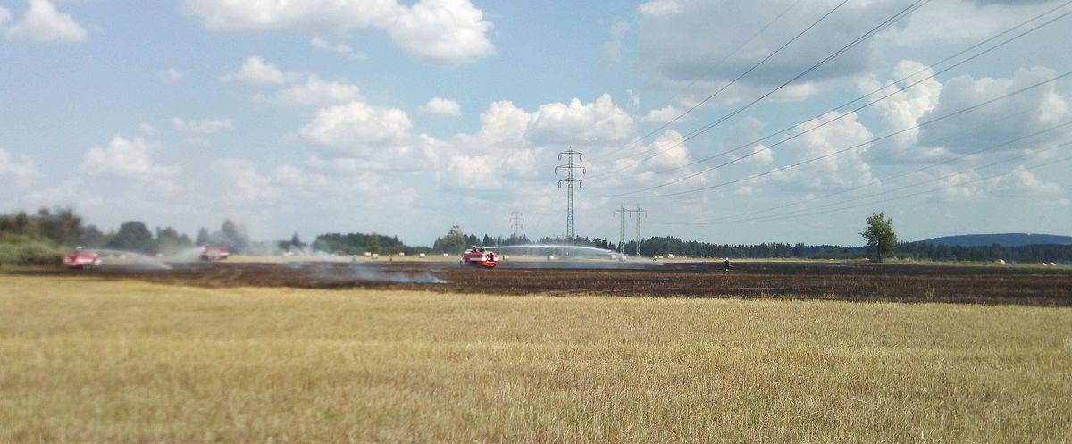 Větší plochu pak museli hasit jednotky u Otročína, kde hořelo strniště a zhruba čtyřicet balíků slámy.